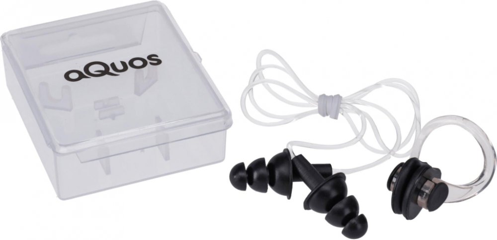 Sada vodního skřipce a ucpávek uší AQUOS EAR PLUG + NOSE CLIP SET zaručuje maximální pohodlí při plavání a jiných vodních sportech. Nosní svorka je vyrobena z kvalitního materiálu s měkkými polštářky.