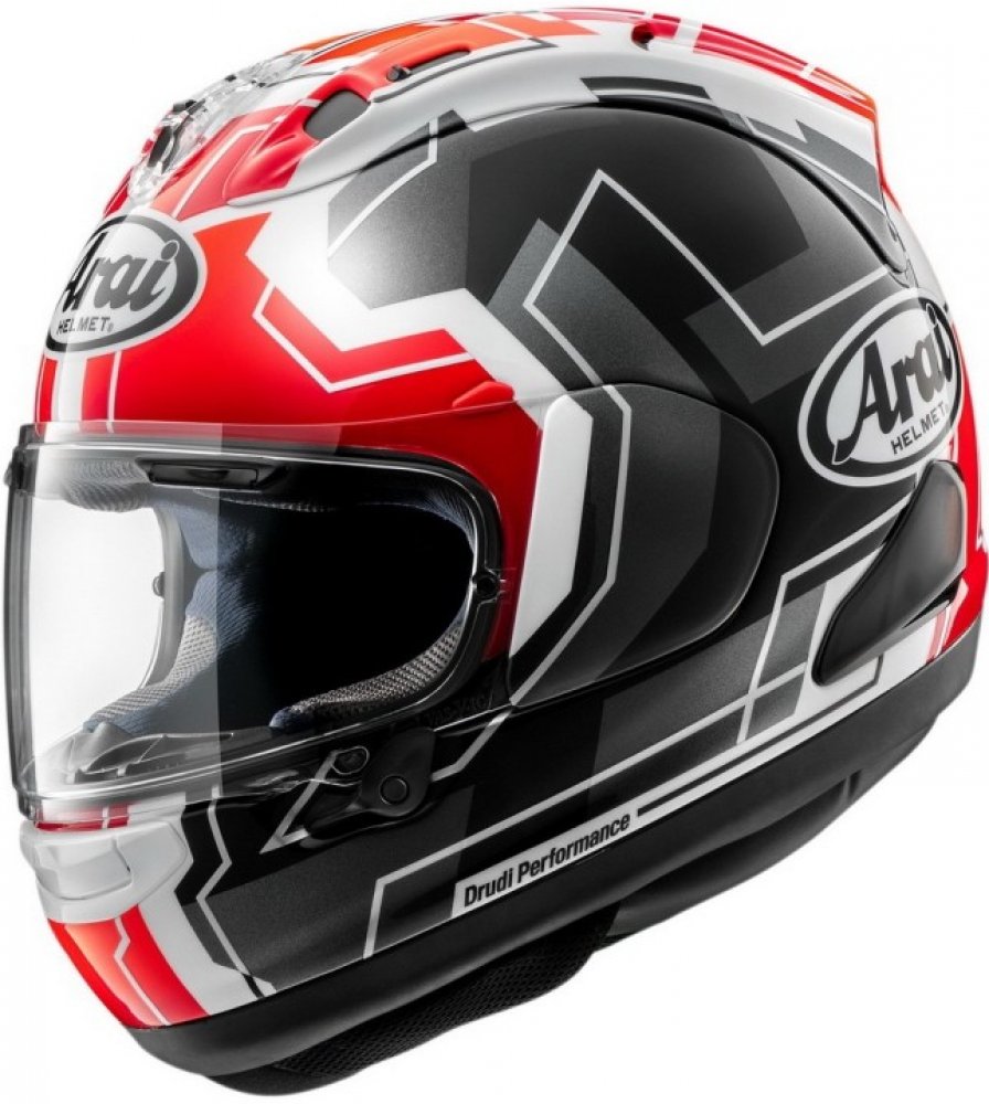 Závodní helma na motocykl Arai RX-7V EVO pro sportovní využití, vybavená nejnovějšími materiály a technologiemi používanými společností ARAI.