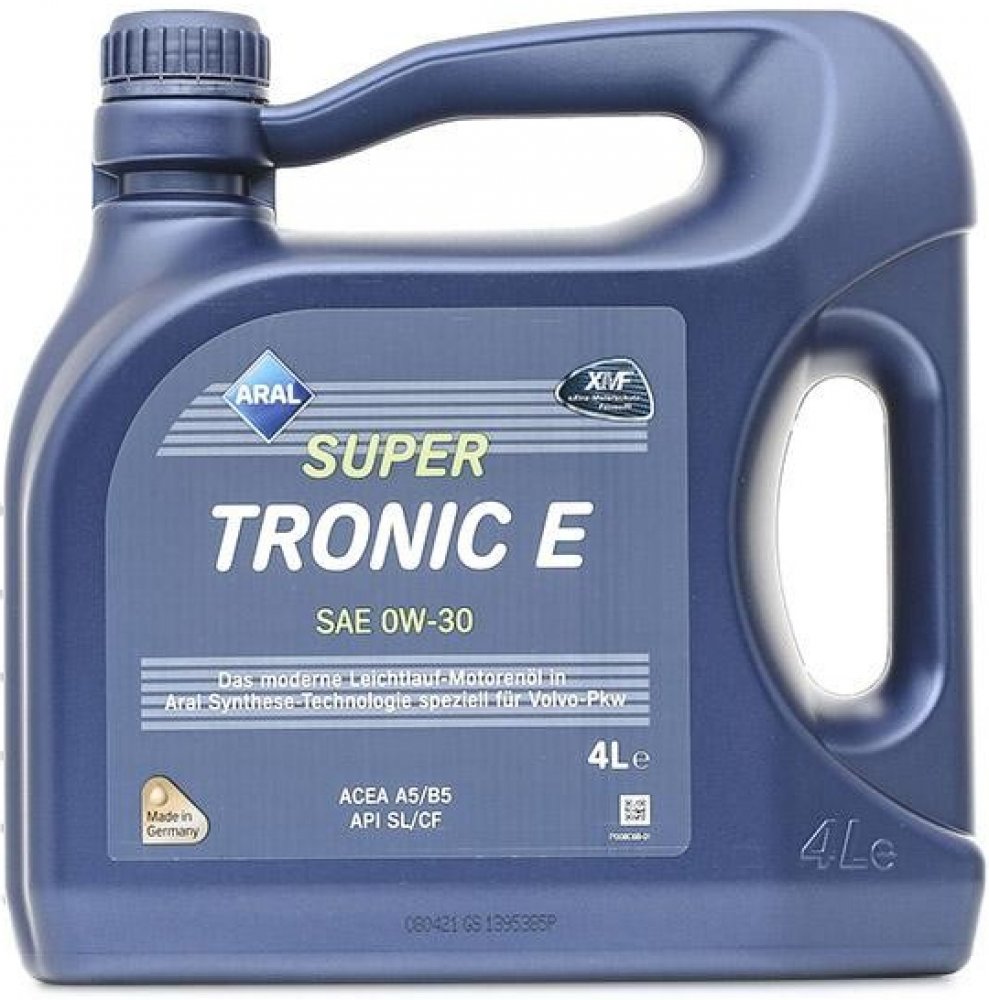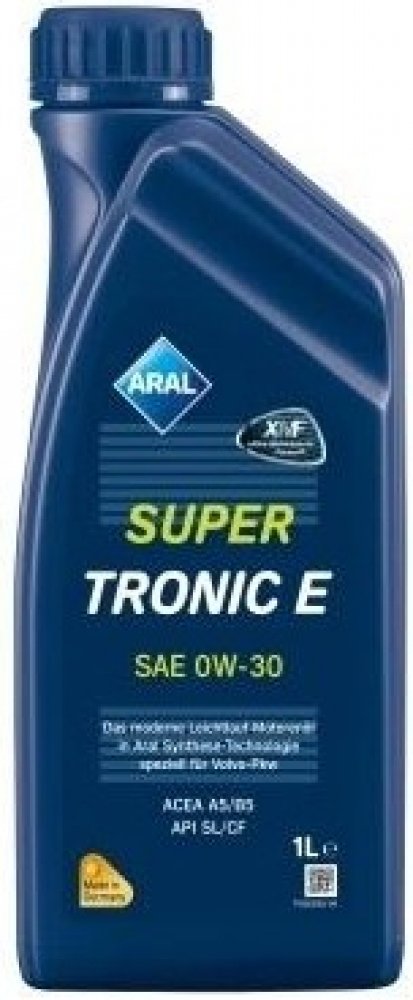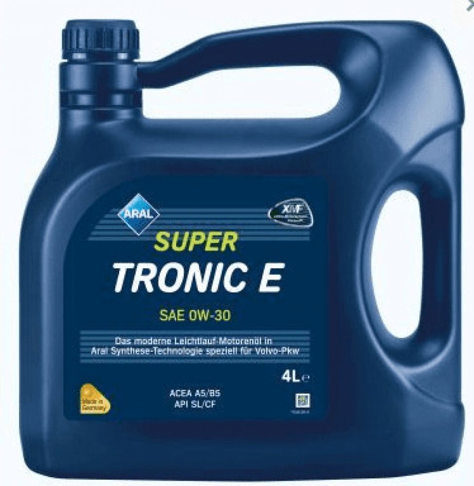 Aral SuperTronic E 0W-30, 4L Aral SuperTronic E 0W-30 je vysoce výkonný motorový olej se znamenitými lehkoběžnými vlastnostmi vyrobený Aral Synthetic-Technology, speciálně koncipovaný pro použití ve čtyřdobých zážehových i vznětových nejmodernějších motorech, jak podle specifikace ACEA A5, B5 požadují např. výrobci automobilů Volvo, Honda a Renault. Použitá technologie XMF™ v tomto oleji přináší ve významné míře úsporou pohonných hmot a tím přispívá k ochraně životního prostředí. Pro prodloužené výměnné intervaly některých modelů značky Volvo Specifikace: SAE 0W-30, ACEA A5/B5, API SL