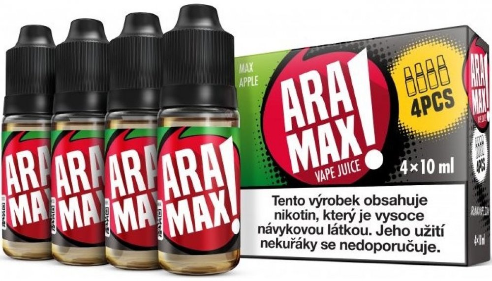 MAX APPLE - Aramax 4pack 4x10ml - výrobce zaručuje skvělý projev v jakémkoliv modelu e-cigarety. Pokud tak hledáte cenově dostupnou náplň do své e-cigarety, jsou e-liquidy Aramax skvělou volbou.