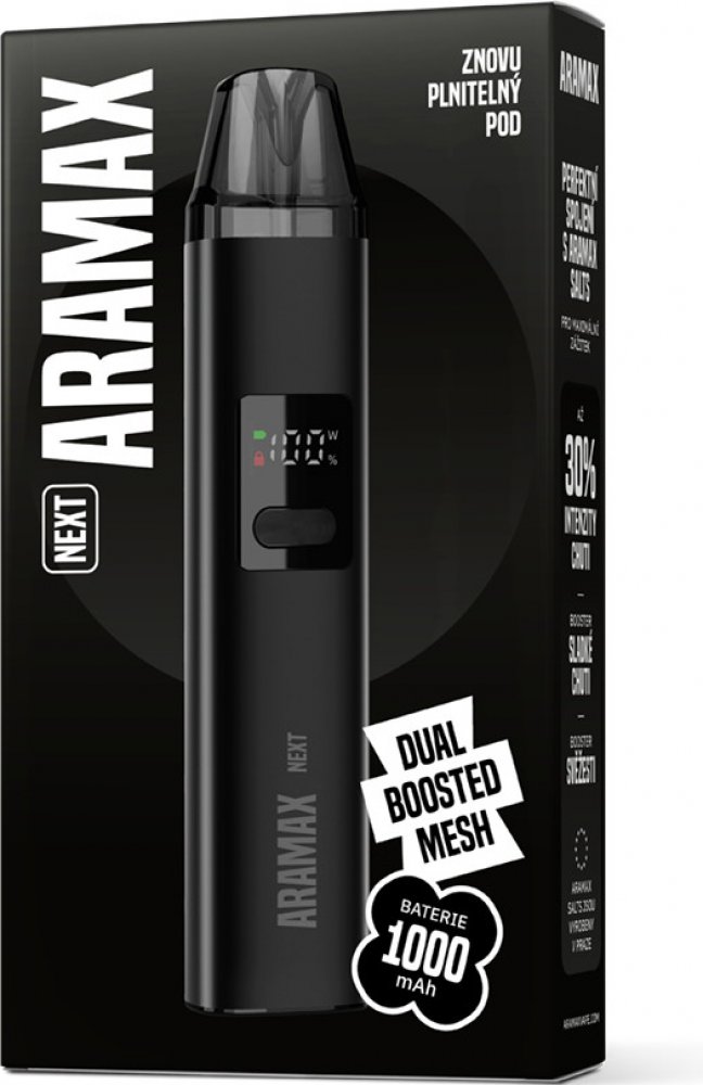Aramax NEXT POD nabízí solidní technické parametry, které zajišťují prvotřídní zážitek z vapování. Elektronická cigareta je vybavena výkonnou integrovanou baterií s kapacitou 1000 mAh, která poskytuje dlouhou výdrž i při intenzivním používání. Maximální výstupní výkon dosahuje 20 W, což je optimální hodnota pro vyváženou kombinaci bohaté produkce páry a výrazné chuti. Zařízení používá speciální cartridge s inovativní dual Boosted Mesh spirálkou, které jsou dostupné ve dvou variantách s různými odpory – 0,8 Ω a 1,2 Ω. Tato technologie minimalizuje výskyt tzv. hotspotů (míst s nerovnoměrným žhavením) a zajišťuje konzistentní a jemný potah s maximálním přenosem chuti. S objemem 2 ml poskytují cartridge dostatečnou kapacitu pro každodenní vapování bez nutnosti častého doplňování.