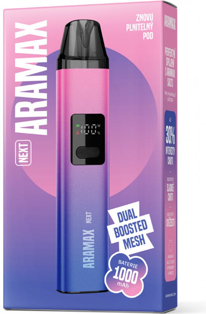 Aramax Next Pod zaujme svým kompaktním kovovým tělem s pogumovaným povrchem, který zajišťuje pohodlný úchop. Minimalistický vzhled doplňuje barevný displej, na kterém snadno nastavíte výkon, sledujete stav baterie a upravíte airflow. Díky rozměrům 116,5 × 25 × 14 mm se vejde do každé kapsy a je perfektní volbou pro vaping na cestách.