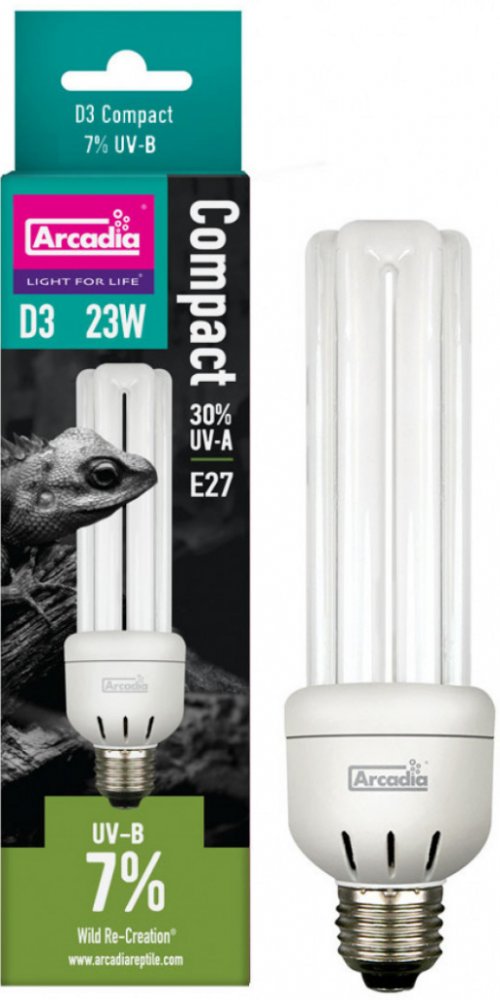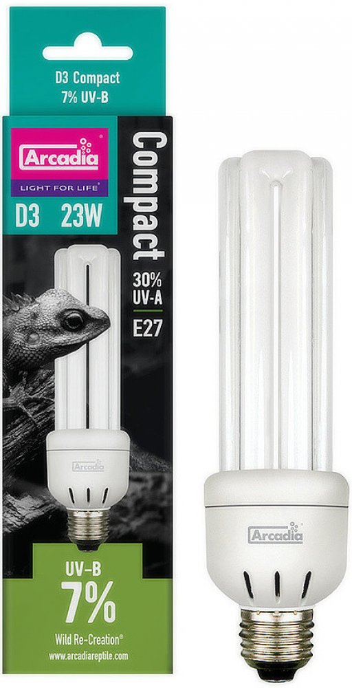 Kompaktní žárovky Arcadia jsou velmi šikovným a úsporným řešením, jak poskytnout plazům světlo a správné množství UVB záření. Vydávají pouze malé množství tepla, proto se hodí i do velmi malých terárií (jako jediný zdroj světla a UVB), nebo jako dodatečný zdroj do velkých terárií (pro vytvoření lokálního místa pro slunění s dostatkem UVB).