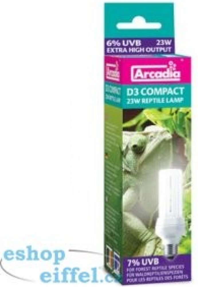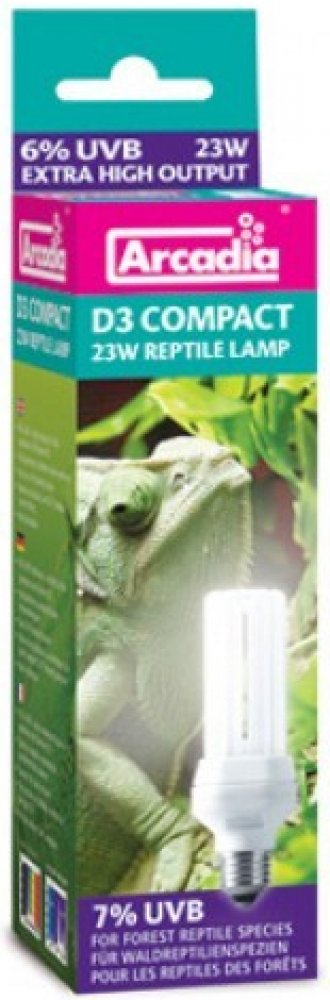 Arcadia D3 Compact 7.0 UVB s wattáží pouhých 23W je určena pro tropická vlhká terária a pro druhy plazů, jako jsou chameleoni, leguáni, denní gekoni, stromoví varani, agamy z vlhkých deštných lesů apod.