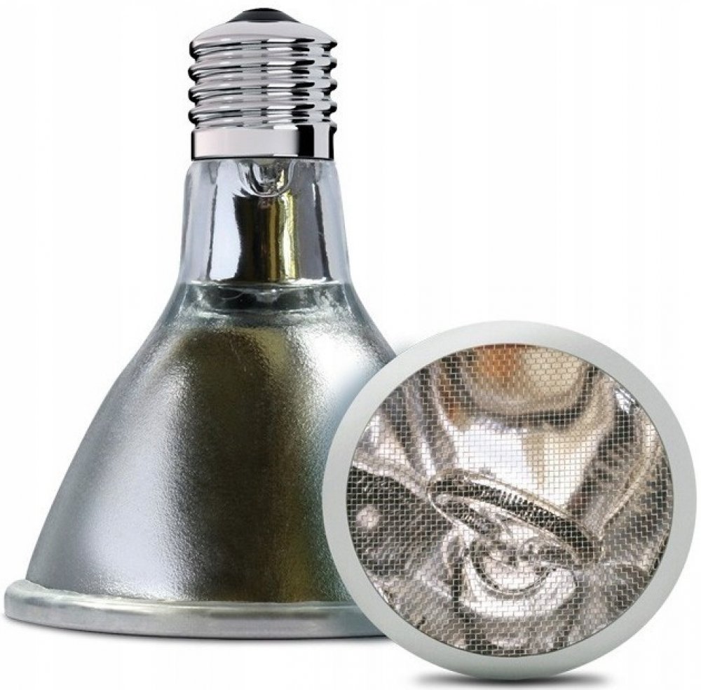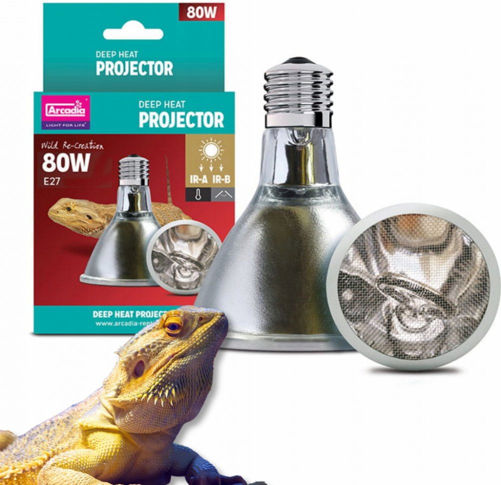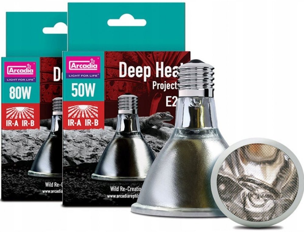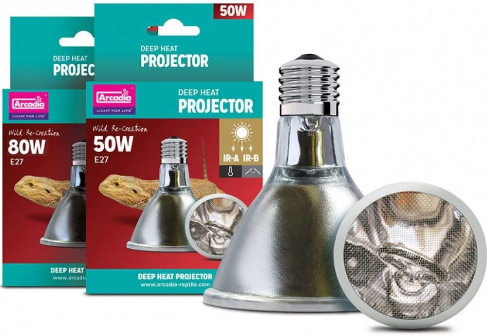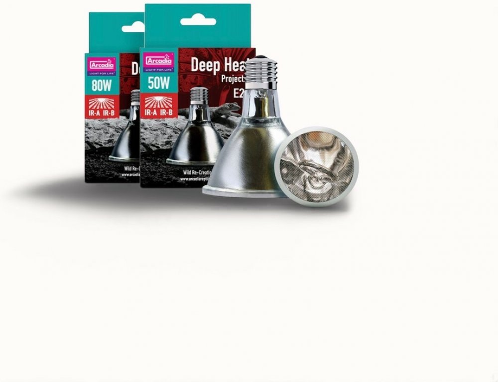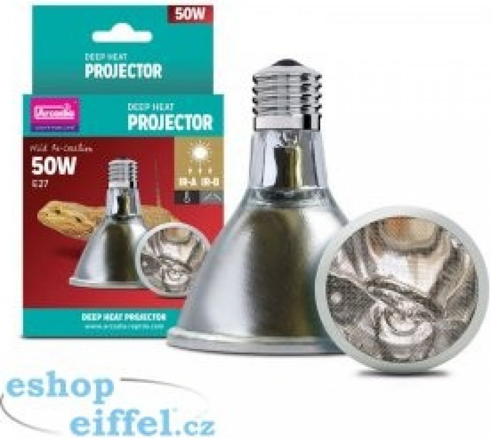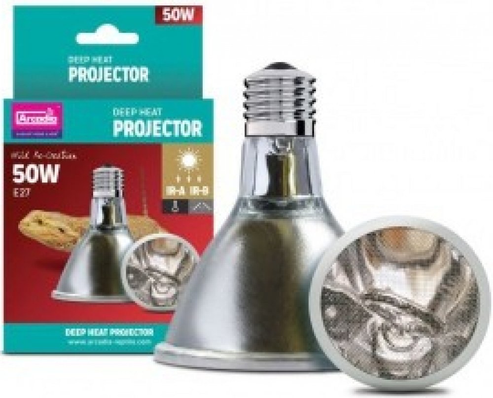 Deep Heat Projector je inovativním produktem v oblasti vyhřívání terárií. Jako jediný zdroj určený pro klasické objímky E27 vyzařuje dva druhy infračerveného záření, Infra-Red A a Infra-Red B. Infračervené B záření dosud nikdy nebylo k dispozici v komerčně nabízených zdrojích tepla. Slunce nám poskytuje teplo pomocí infračerveného záření A a B (IRA, IRB), infračervené C záření je pak filtrováno atmosférou. Spojení těchto dvou druhů záření umožňuje zvířatům vyhřívat se přesně tak, jako v přírodě - teplo proniká hluboko do svalových tkání. Pokud bychom se pod takovým zdrojem tepla vyhřívali sami, ucítíme příjemné teplé mravenčení - stejné, jako bychom se opalovali na slunci. Arcadia Deep Heat Projector poskytuje zvířatům správnou formu tepla bezpečnou a přirozenou cestou, stejně jako je tomu v divoké přírodě. Nehrozí zde riziko přehřátí jako u obyčejných bodových žárovek. Deep Heat Projector je energeticky úsporný, 50W verze poskytuje stejné teplo a energii jako 100W žárovka, což znamená značné snížení karbonové stopy. Design reflektoru směřuje teplo přímo na zvířata, nedochází tedy ke zbytečným tepelným ztrátám do okolí. Deep Heat Projector nevyzařuje viditelné světlo a lze jej tedy používat i pro noční ohřev. Nevyzařuje UVB záření, doporučujeme tedy jeho použití spolu s vhodnými zdroji UVB, popř. společně s LED osvětlením. Vhodným doplňkem pro optimální kontrolu teploty je spolehlivý termostat.