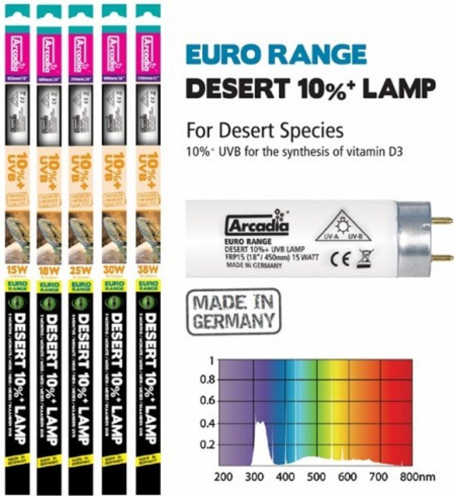Díky vývoji technologií je Arcadia nyní schopna vyrábět škálu zářivek T8, které vyzařují daleko více UVA i UVB a mají životnost plných 9 měsíců.