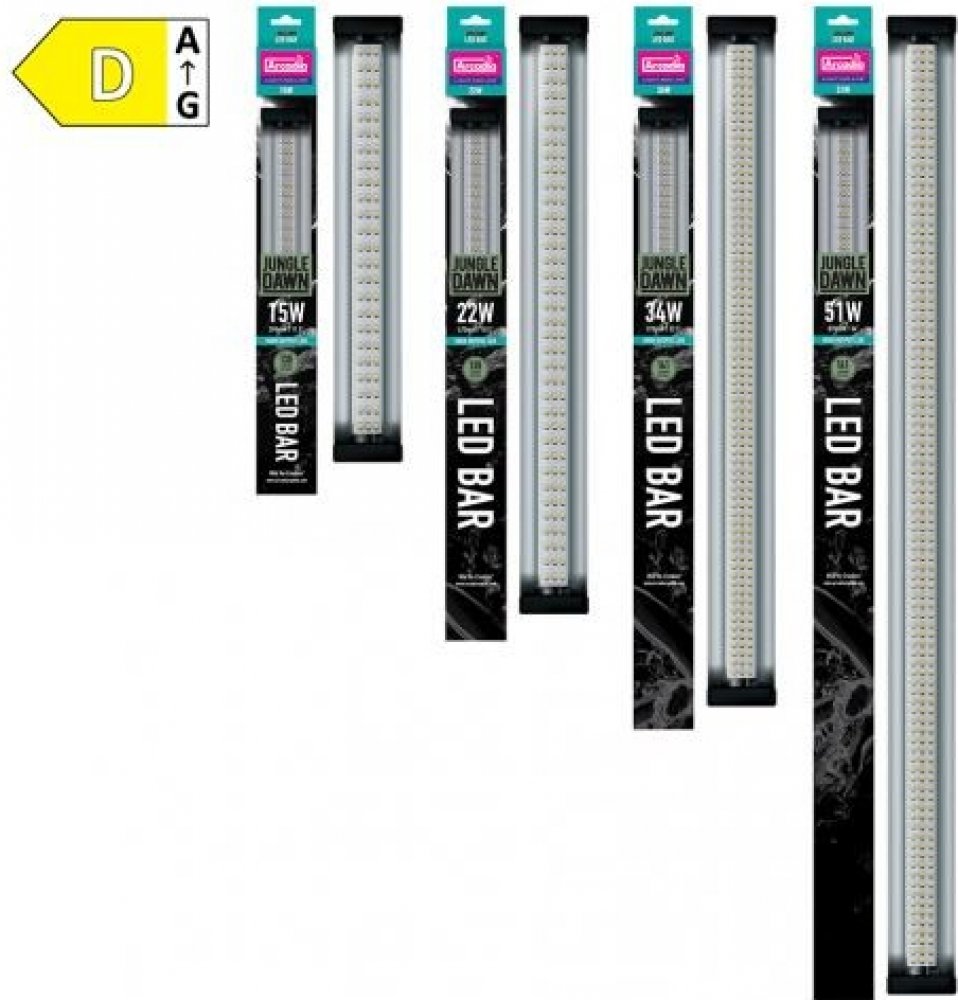 Použitím LED diod s velmi specifickým designem bylo vytvořeno osvětlovací těleso, které projektuje velmi mnoho viditelného světla s vysokými hodnotami PAR. JungleDawn-LED Bar velmi dobře napodobuje přirozené viditelné světlo (6200 Kelvinů) a je zvláště vhodný pro osvětlování rostlin, aniž by byly použity nežádoucí červené a modré diody. Jako takové má těleso JungleDawn-LED Bar výdej světla s vysokými hodnotami PAR, vysoké procento PUR, vysoké CRI a nevydává žádné nafialovělé světlo. Pozor! Tento typ LED osvětlení neposkytuje UVB záření!