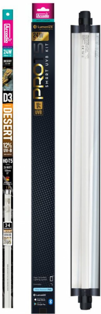Zlepšení životních podmínkek zvířat prostřednictvím cirkadiánního rytmu a zajištění sezónních cyklů, největší výhody revoluční novinky LumenIZE® od společnosti Arcadia Reptile. Ovládejte zářivky prostřednictvím jedné snadno použitelné bezplatné aplikace a snižte provozní náklady v průměru o 30 %! Arcadia vytvořila řadu špičkového osvětlení, která změní způsob, jakým se staráte o svá zvířata. Zářivky lze stále propojovat pomocí spojovacích sad, až 8 jednotek lze propojit dohromady a lze je provozovat z jednoho zdroje energie a ovládat pomocí aplikace LumenIZE®. Produkty Arcadia Reptile LumenIZE® způsobí revoluci v osvětlení terárií a poskytnou vám bezkonkurenční kontrolu nad světelnými podmínkami. PRO T5 LumenIZE® je značně vylepšená kompletní sada provozní jednotky a UVB zářivky T5. Osvětlení je kontrolované aplikací, kterou si jednoduše stáhnete na stránkách výrobce zde (App Store) nebo zde (Google Play). PRO T5 LumenIZE® nepotřebuje být připojený k internetu, vždy se pouze spojí s Vaším telefonem či tabletem technologií Bluetooth. LumenIZE® je stmívatelné osvětlení, snadno proto napodobíte úsvit, stmívání, plné polední slunce či počasí pod mrakem. Zařízení si pamatuje své nastavení i v případě výpadku proudu díky vestavěné, vyměnitelné baterii, která vydrží cca 3 roky. Provoz je možný v pouštních i velmi vlhkých tropických teráriích díky voděodolnosti stupně IP65. Díky moderní technologii je úspora energie až 30%. Arcadia PRO T5 LumenIZE® obsahuje 12% UVB záření, je určena pro pouštní druhy plazů, jako jsou např. agamy vousaté. I když by se to na první pohled nemuselo zdát jako důležité, plazi velmi citlivě reagují na světlo a jeho intenzitu. Proto pokud je osvětlení napojeno na spínací hodiny, vždy se zapne na svůj plný výkon, nebo resp. vypne do úplné tmy. Hodnoty UVB záření během dne jsou v přírodě také rozdílné. Plazi tak přicházejí o přirozenou součást světelného dne, jako je úsvit nebo stmívání. Toto zásadně ovlivňuje jejich aktivitu a přirozené životní projevy – mnoho druhů je např. aktivních za soumraku, kdy ještě není úplná tma, ale světla už v přírodě není dostatek. Arcadia LumenIZE® je proto chytrým a ideálním řešením pro všechny chovatele, kteří chtějí poskytnout chovaným zvířatům ty nejlepší světelné podmínky. Doporučení: zářivky je vhodné měnit každých 12 měsíců, aby byl zajištěn optimální výdej UVB záření. Pro výměnu se používají klasické zářivky Arcadia T5 dané specifikace (2.5 – 14% UVB). Všechny tyto zářivky naleznete ve stálé nabídce našeho obchodu. Pro dosažení ideálních světlených podmínek v teráriu doporučujeme kombinovat UVB zářivky s LED osvětlením, např. s využitím stejné technologie Arcadia LumenIZE® Jungle Dawn. Rozměr osvětlovacího tělesa 24 W:D.59,5cm x Š.6,1cm x V.5,9cm Rozměr osvětlovacího tělesa 39 W:D.89,5cm x Š.6,1cm x V.5,9cm Rozměr osvětlovacího tělesa 54 W:D.119,5cm x Š.6,1cm x V.5,9cm Délka el. přívodního kabelu: 1,9 m