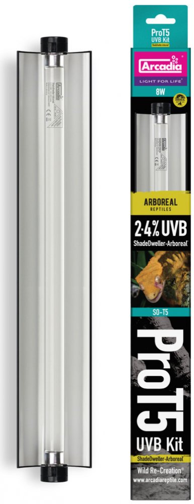 Kompletní osvětlovací těleso obsahuje zářivku T5 ShadeDweller Lamp Arboreal s optimálním výdejem 12% UVA a 2,4% UVB záření, 6000K. Arcadia PRO T5 UVB Kit je rovněž vybaven reflektorem, který nabízí dva úhly odrazu, zónu pro vyhřívání a rozprostření světla . Celý systém je konstruován tak, aby bylo možné zapojit za sebou až 10 jednotek, které budou napájeny z jednoho zdroje.
