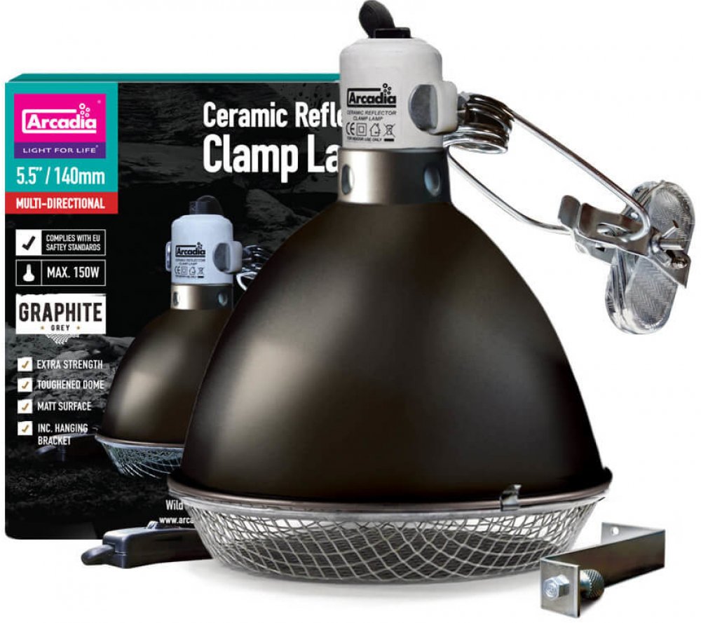 Jedná se o plně vybavenou sadu obsahující vše potřebné k bezpečnému používání žárovek a tepelných zářičů. Tato stylová sada zajišťuje bezpečí chovaným zvířatům i chovateli, navíc chrání lampu uvnitř před poškozením. Větrací otvory ve vrchní části reflektoru zajišťují dostatečné odvětrávání. Clamp Lamp je vybavený odolnou keramickou objímkou s paticí E27. V případě použití kompaktní zářivky je značnou výhodou zesílení dosahu UVB/UVA záření a množství vyzařovaného světla díky reflektujícímu povrchu uvnitř reflektoru.