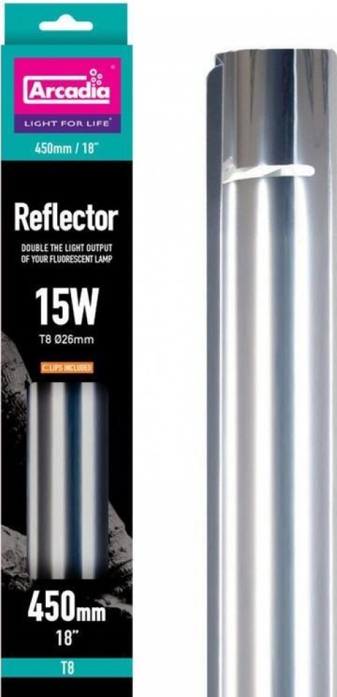 Reflektory pro zářivky typu T8 jsou vyrobeny z kvalitního hliníku. Kromě ochranné funkce zářivky jsou důležité pro správné směrování světla a jeho znásobení. Vhodný reflektor nejen namíří světlo ze zářivky požadovaným směrem (tj. dovnitř terária či akvária na zvířata), ale také znásobí výdej světla až o 200%, protože světlo a UVB vyzařované po celém okruhu zářivky je odraženo a a dostane se tedy přesně tam, kde potřebujeme. Balení obsahuje držáky reflektoru a montážní příslušenství. Doporučujeme používat reflektory s každou zářivkou.