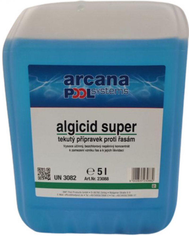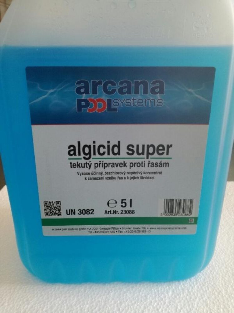Bazénová chemie Algicid Super 5l je vysoce účinný tekutý koncentrát k zamezení vzniku řas a k jejich likvidaci. Jedná se o bazénovou chemii ověřené kvality. Algicid Super od rakouské firmy Arcana patří mezi špičku v evropské bazénové chemii. Algicid Super je bez zápachu, chuti a nepění.