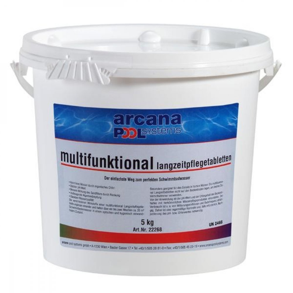 Multifunkce 5v1 patří mezi nejprodávanější bazénovou chemii. Díky kombinaci pěti účinných látek zvládnete udržet bazén pouze na multifunkčních tabletách. Multifunkční tablety od rakouského výrobce Arcana patří mezi špičku v evropské chemii.