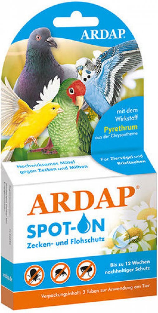 ARDAP SPOT-ON pro ptáky s účinnou látkou pyretrum z chryzanteny je vysoce účinný prostředek k zevnímu použití u okrasných ptáků a holubů. Díky repelentnímu účinku nabízí ARDAP SPOT-ON spolehlivou a dlouhotrvající ochranu před klíšťaty a roztoči.