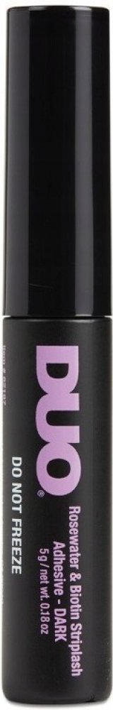 Rosewater & Biotin Striplash Adhesive značky DUO. Lepidlo na řasy. Ideálně připevňuje k očnímu víčku trsy, poloviny i celé řasy v pásech. Zaručuje, že řasy vydrží na očních víčku po celý den od doby aplikace. Je obohacen o blahodárnou růžovou vodu a biotin, které profesionálně pečují o vlasy a také je posilují, zklidňují a zklidňují podráždění. Lepidlo zajišťuje trvanlivost a pohodlí při použití. Rychle schne a nezanechává na očním víčku žádné viditelné stopy. Produkt je k dispozici ve dvou odstínech – bílé/clear (po oxidaci se stává průhledný) a tmavě modrém tónu.