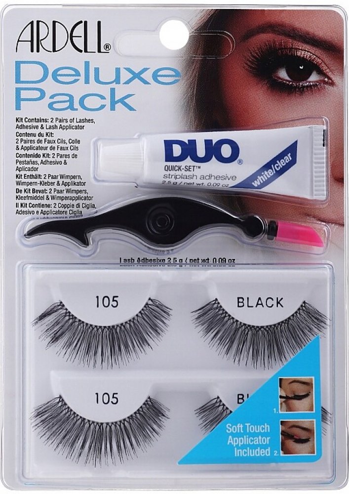 Sada obsahuje: lepidlo na řasy, aplikátor na řasy, dva páry umělých řas 105 Black.