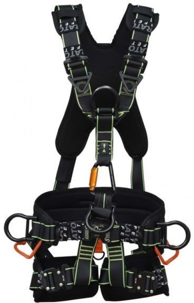 upevňovací body - 1 zádový D-kroužek a 1 hrudní D-kroužek pro zachycení pádu, 1 ventrální D-kroužek v úrovni pasu pro lanový přístup, 2 boční D-kroužky v úrovni pasu pro pracovní polohování