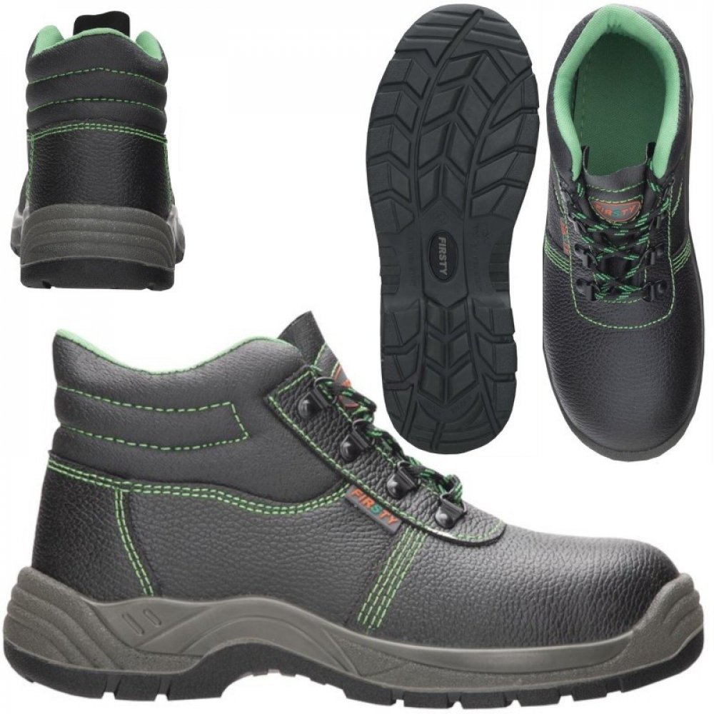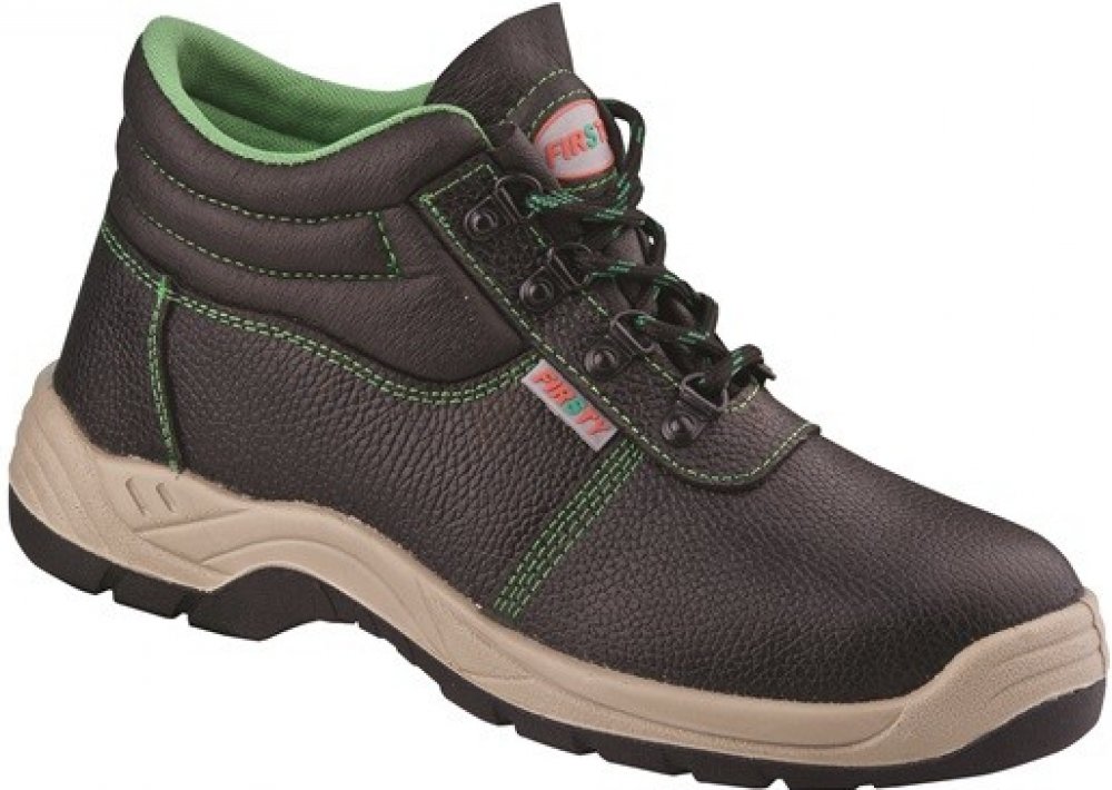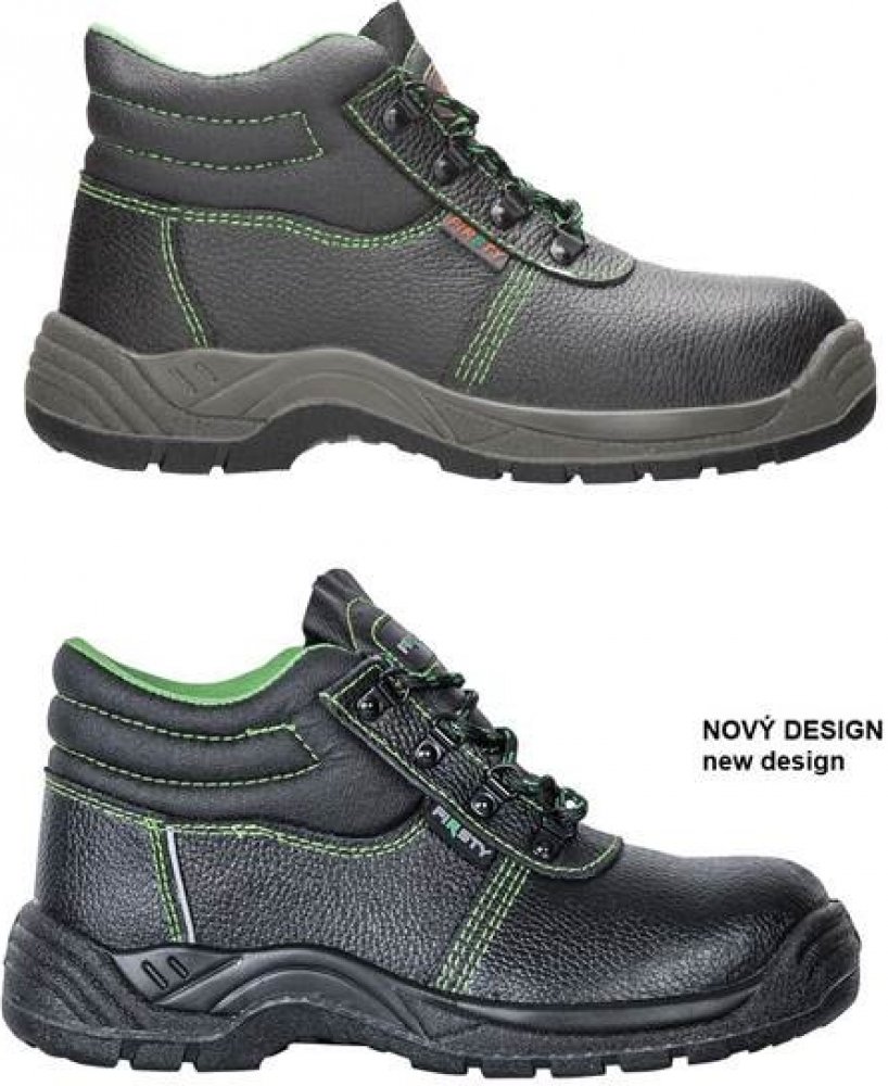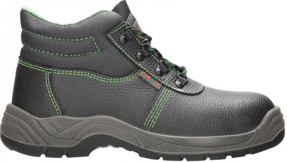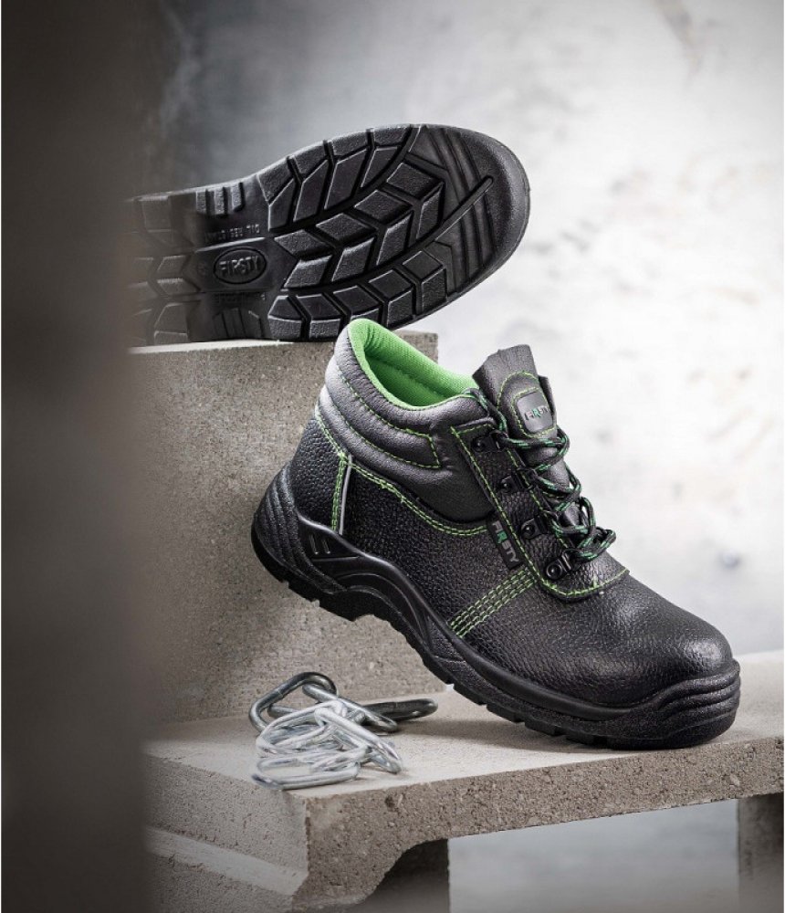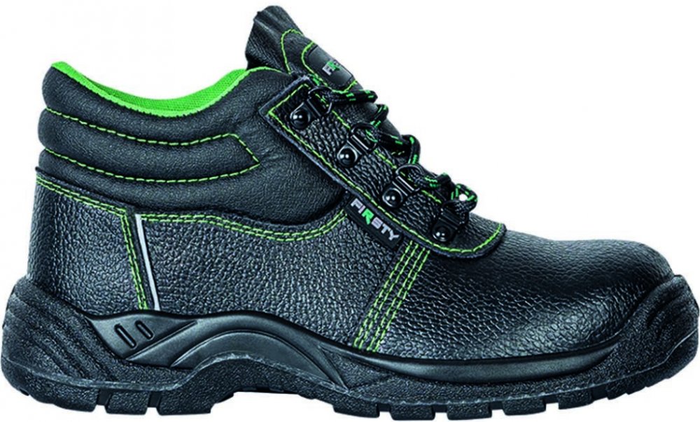 Kotníkové boty FIRSTY S3 jsou nejen elegantně vyhlížející, ale především praktické. Udržují kotník stabilní a respektují přirozený pohyb chodidla. Jsou vyrobené z hovězí usně a disponují ocelovou špicí a planžetou, které přispívají k vaší ochraně.Vzorek na podrážce zabraňuje špatnému našlápnutí a uklouznutí. To ocení především pracovníci provozoven s kluzkými povrchy. Antistatická podešev z odolného PU2D vás spolehlivě ochrání před vnějšími vlivy, jako jsou různé oleje, pohonné hmoty či kontaktní teplo až do 110 °C. Pokud vás obuv FIRSTY S3 zaujala, můžete si vybrat ze široké škály velikostí v rozmezí 35-50. Boty mají černou barvu oživenou kontrastním zeleným prošitím.