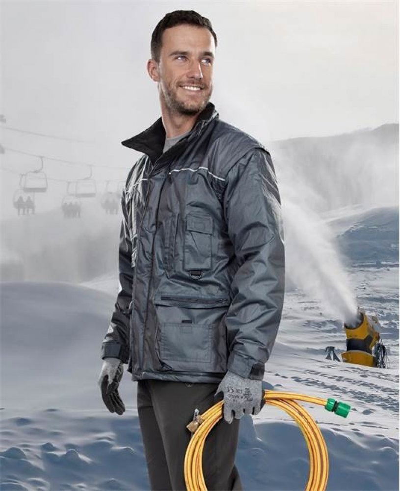 Nepromokavá zimní pracovní bunda z PVC/polyesteru, s odnímatelnými rukávy, vnitřní materiál fleece, zapínání na krytý zip, nastavitelná šířka rukávů a spodního lemu, multifunkční kapsy, reflexní doplňky, velikost S-XXXL, tmavě modrá barva. K dispozici také zimní pracovní kalhoty Lino. Zde si k tomuto pracovnímu oděvu můžete stáhnout EU prohlášení o shodě.