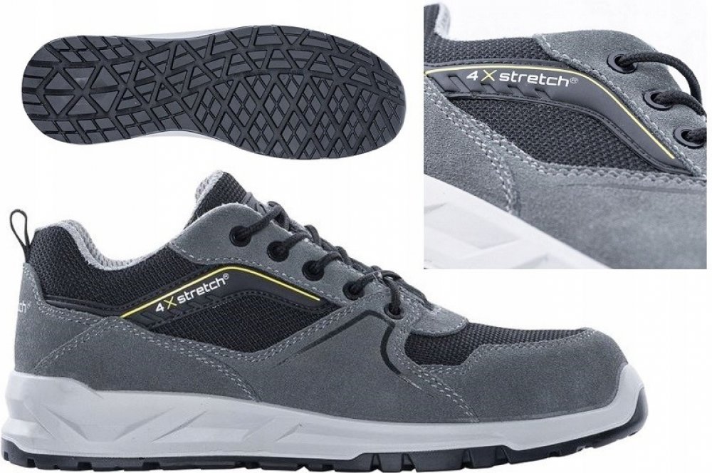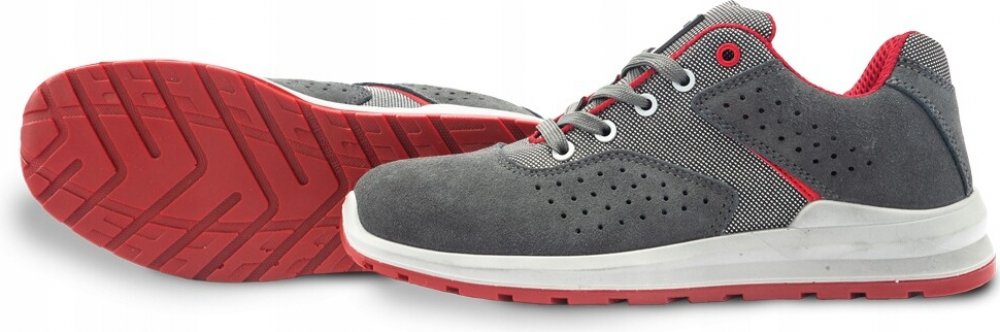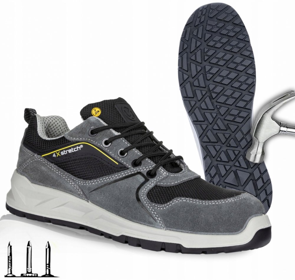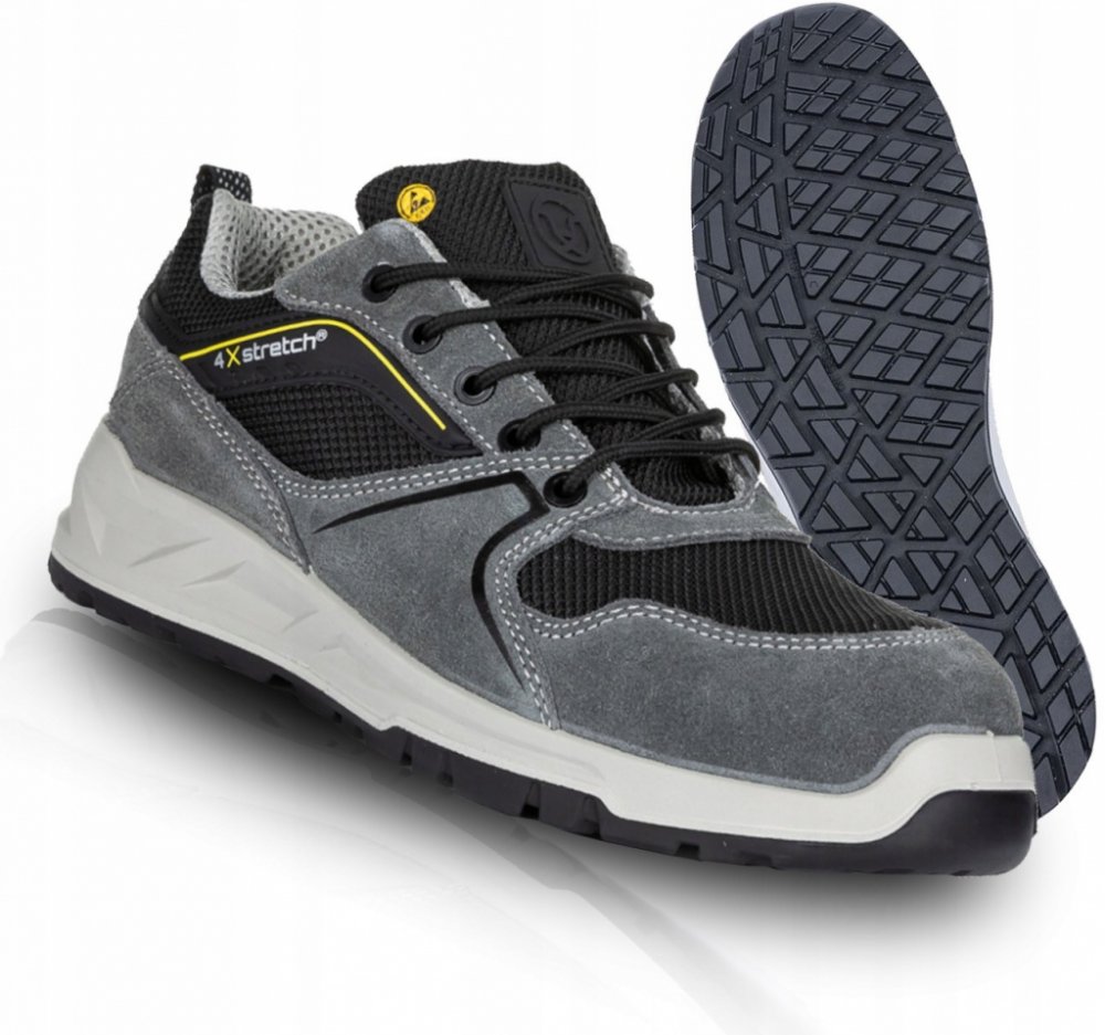 Bezpečnostní polobotka se sklolaminátovou tužinkou a kevlarovou planžetou, o zvýšený komfort chodidla se stará vkládací stélka FOAM COMFORT, lehká podešev z dvouhustotního polyuretanu splňuje SRC požadavky na protiskluz. Obuv je bez kovových součástí, model je ESD, tj. chrání před elektrostatickým výbojem, a proto může být využíván v EPA prostorách, materiál: broušená hovězinová useň, VELUR/textilie OXFORD, podšívka: laminovaná prodyšná textilie typu MESH, vkládací stélka: FOAM COMFORT - anatomicky tvarovaná, tlumí nárazy v oblasti paty, podešev: PU/PU, dvousložkový nástřik, olejivzdorná, antistatická, protiskluzová. Norma: EN 20345:2011. Váha: 480 g (platí pro půlpár ve velikosti 42). Barva: šedá. Velikosti: 36 - 48.