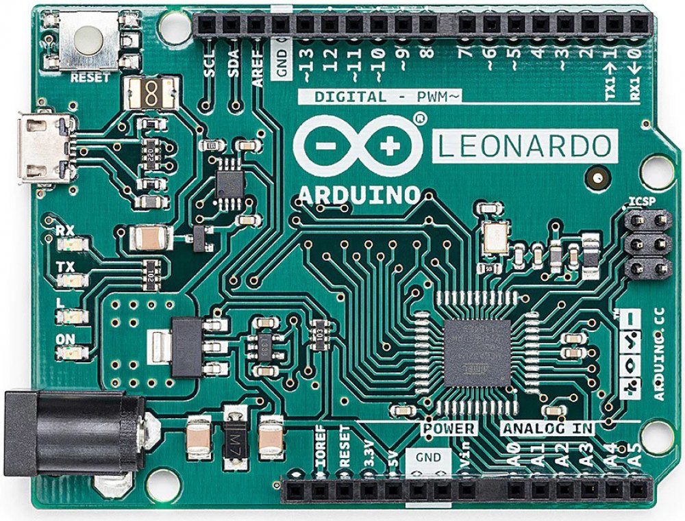 Arduino Leonardo je mikrokontrolér deska založená na ATmega32u4 (datasheet). Obsahuje 20 digitálních vstupně/výstupních pinů (z toho 7 může být použito jako PWM výstupy a 12 jako analogové vstupy), 16 MHz krystalový oscilátor, micro USB konektor, napájecí konektor, ICSP konektor a resetovací tlačítko.