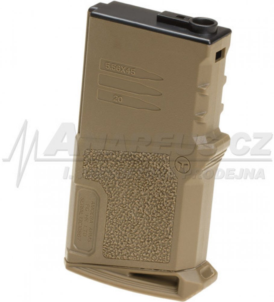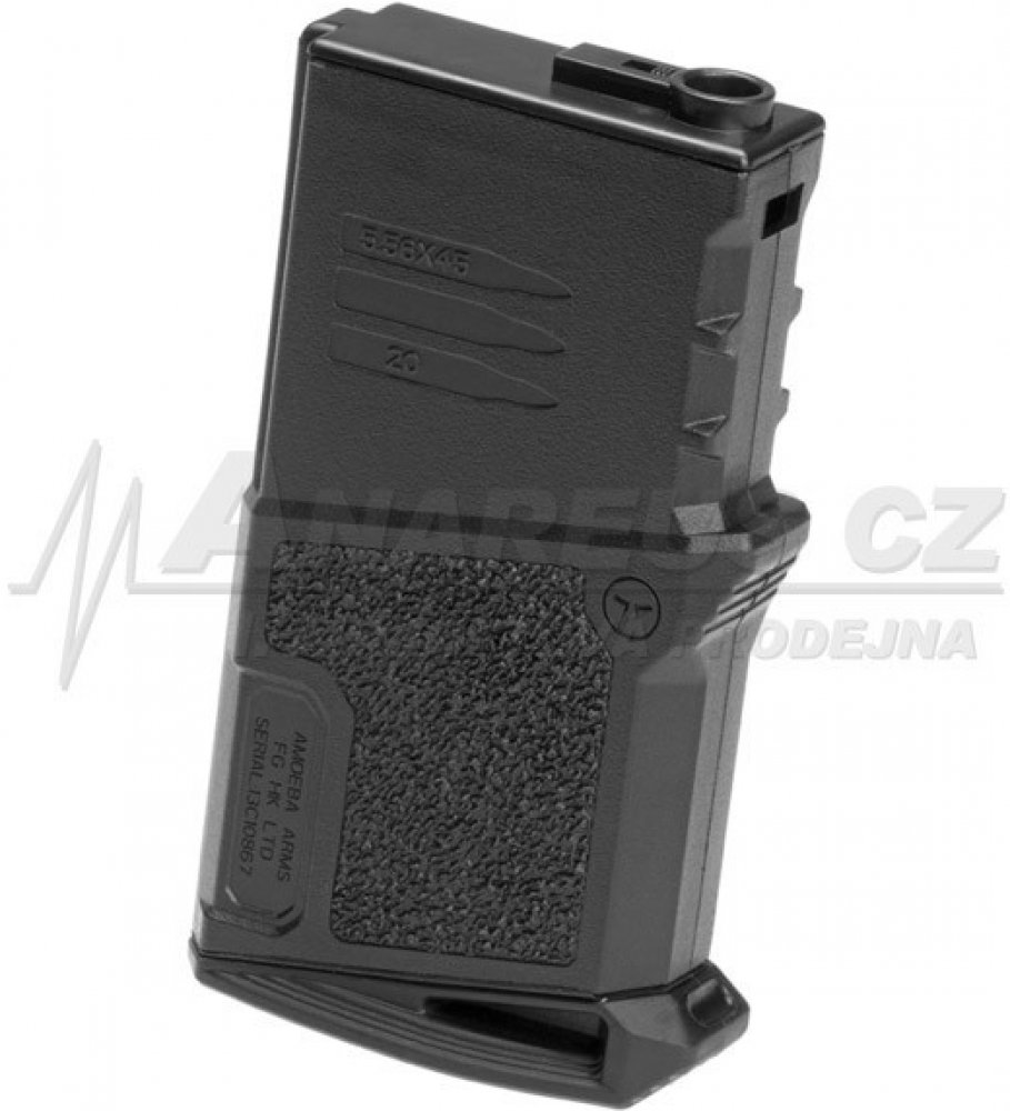 Inovativní zásobník firmy Ares z řady AMOEBA, zdrsnění povrchu proti vyklouznutí a drážky známe u zásobníků například magpul. Velmi přesné zpracování, navíc integrovaný rychlovytahovací pásek. Rozborka zásobníku přes velký imbus ve spodní části zajišťuje snadnou udržbu a čištění.