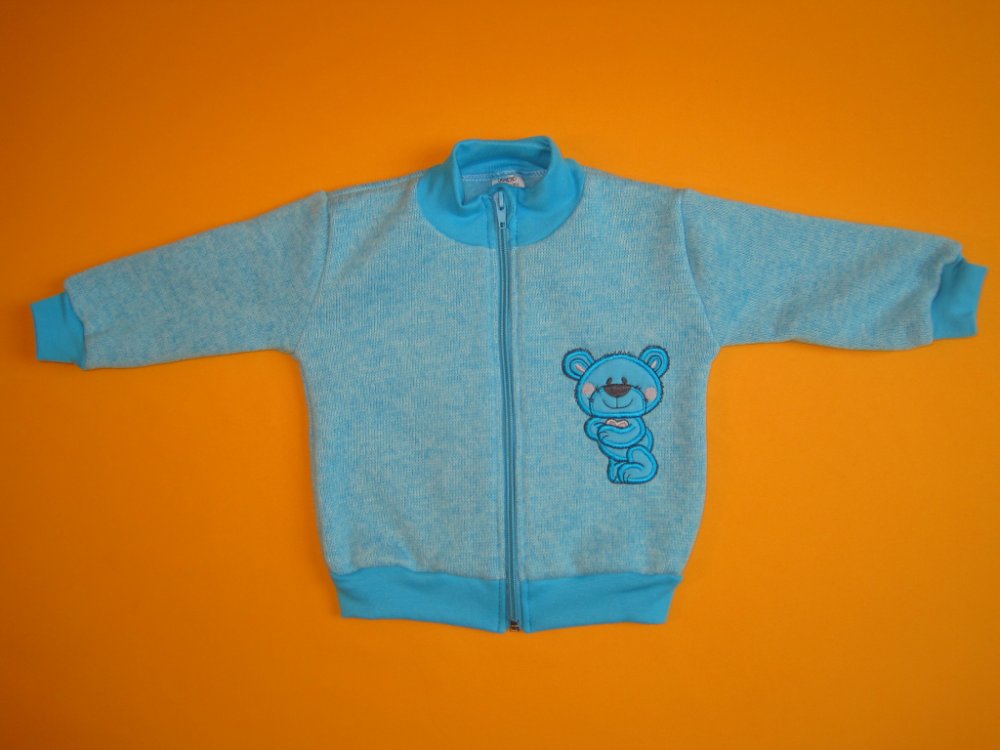 Teploučká kojenecká mikina, která vypadá jako svetřík, je celopropínací se stojáčkem. Svrchní strana příjemného nekousavého materiálu má design úpletu, spodní strana má strukturu flísu. Mikinka je na přední straně levého dílu ozdobena výšivkou. Rukávy jsou zakončeny pružným lemem, stejně jako spodní část. Propínání je na zip s krytkou proti skřípnutí kůže. Doporučený způsob praní v pračce na 40ᵒC.