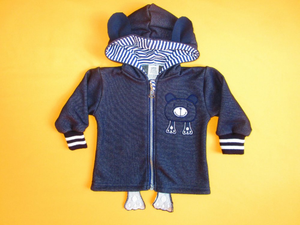 Teplá kojenecká mikinka je ušita ze speciálního materiálu, který je z lícové strany ze 100% bavlny a z rubové strany má měkký příjemný chloupek ze 100% polyesteru, díky kterému je mikinka teploučká. Mikinka rovného střihu je ozdobená hravými a roztomilými aplikacemi, které jsou umístěny na pravém předním díle, na kapuci a na spodní části zadního dílu. Celá kapuce je podšitá příjemnou bavlnou a zdobí ji našitá ouška. Propínání je na zip, u krku je našitá krytka, která brání skřípnutí. Rukávy jsou zakončeny výrazným pružným lemem, barevně sladěným s podšitím kapuce. Ve spodní části obou předních dílů jsou našity kapsy typu rozpůlené klokanky. Doporučený způsob praní: v pračce na 40ᵒC.