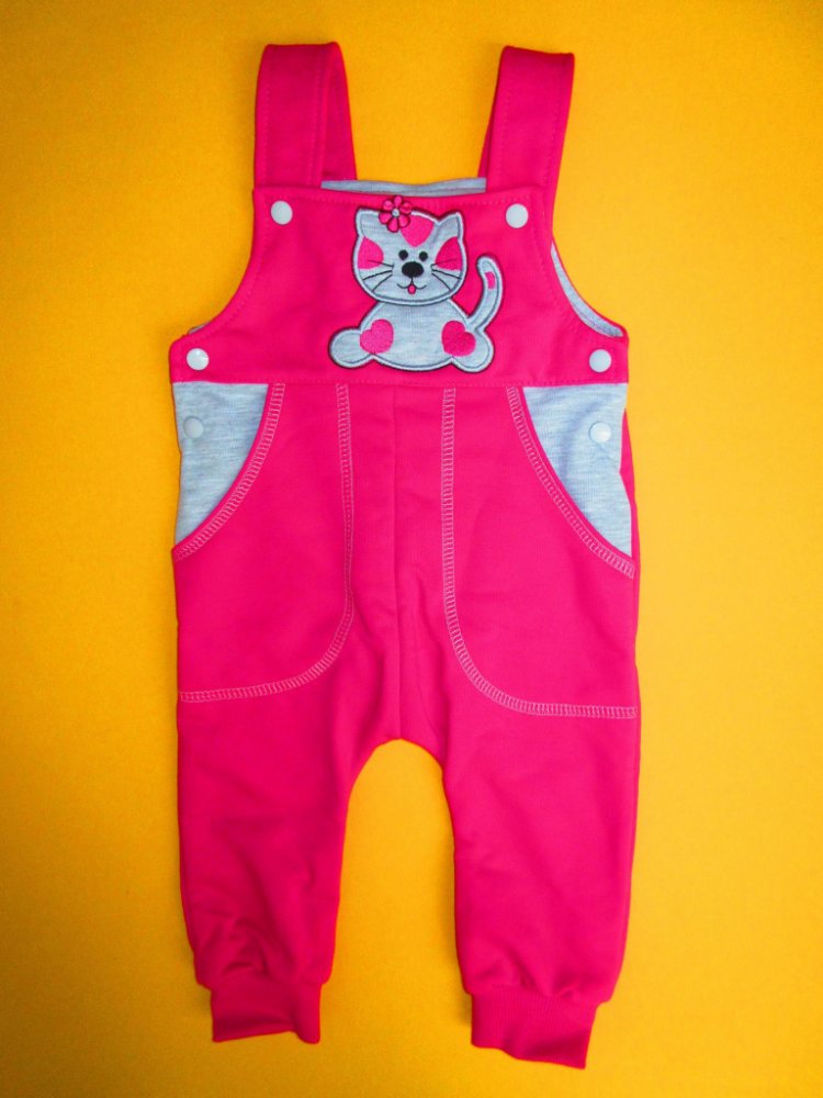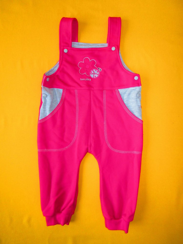 Pohodlné a praktické bavlněné tepláky s laclem jsou zdobeny aplikací v horní části předního dílu. Přední díl je rovněž odzdoben výrazným prošitím 2 všitých kapes zvýrazněných barevně odlišnou vsuvkou. Aby tepláčky dobře seděly, je přední i zadní část laclu podšitá barevně odlišnou látkou. Pro snadné oblékání lze lacl odepnout jak nahoře tak po stranách. Délka kšírek je nastavitelná díky dvěma patentkám našitým v různých výškách. Propínání je na barevně sladěné patentky. Nohavice jsou zakončeny pružným lemem. Tepláky jsou ušity z nepočesaného bavlněného úpletu. Doporučený způsob praní: v pračce na 40ᵒC, prát a žehlit po rubové straně. Upozornění: výšivka na laclu se může lišit od fotografie.