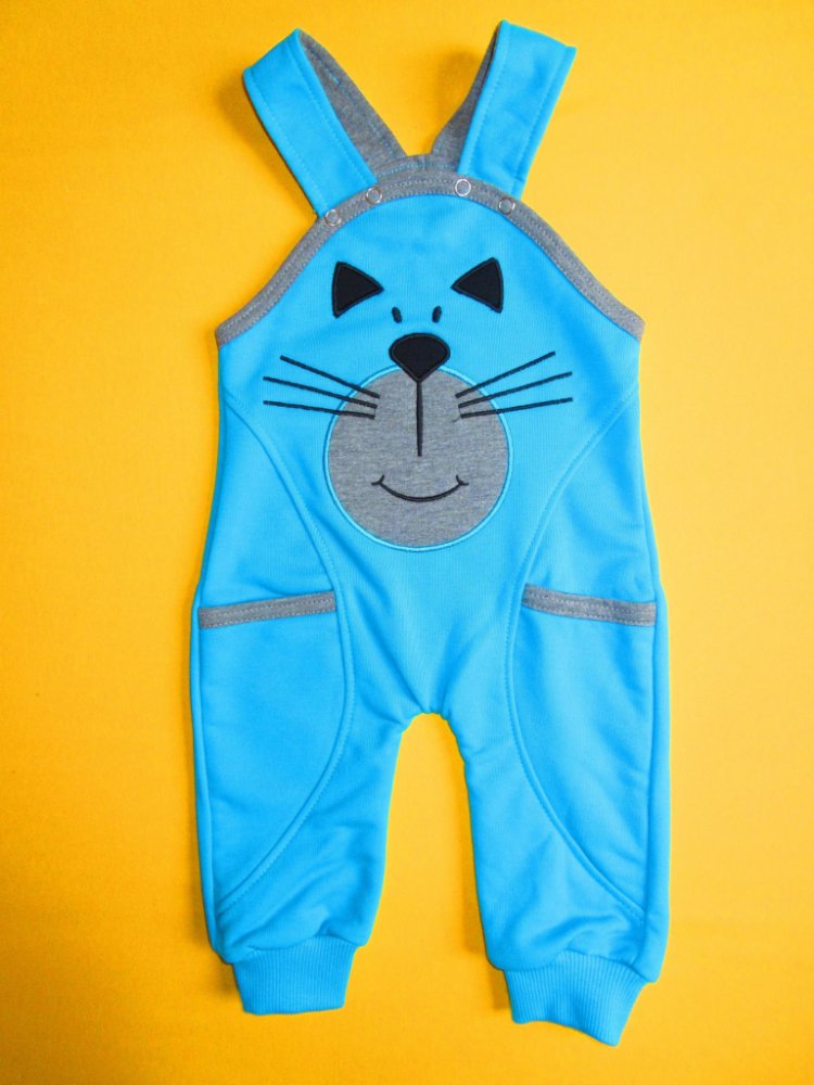 Veselé tepláčky s laclem pro nejmenší jsou ušity z příjemné 100% nepočesané bavlny. Přední díl je ozdoben roztomilou aplikací zvířecího čumáčku. Šle lze nastavit na 2 délky díky dvěma řadám patentek. Na přední části nohaviček jsou našity kapsy zvýrazněné lemováním, stejně jako přední část laclu. Nohavice jsou ukončeny manžetou z pružného lemu. Šle a lacl na zádech jsou z dvojité látky. Zádní část ...