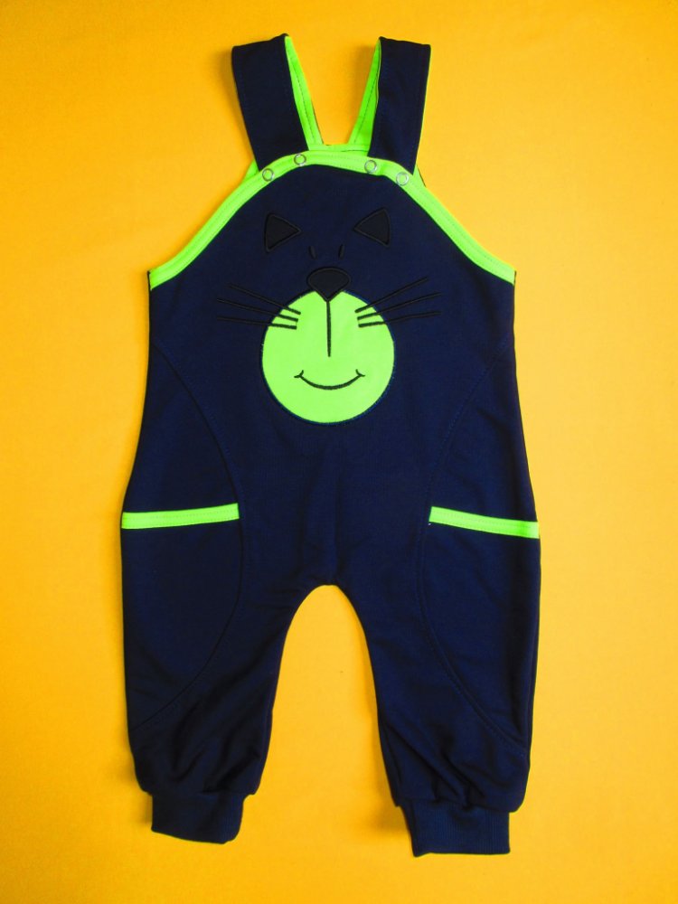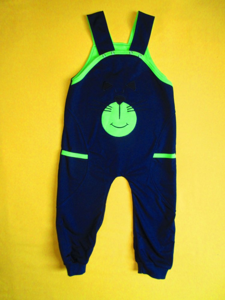 Veselé tepláčky s laclem pro nejmenší jsou ušity z příjemné 100% nepočesané bavlny. Přední díl je ozdoben roztomilou aplikací zvířecího čumáčku. Šle lze nastavit na 2 délky díky dvěma řadám patentek. Na přední části nohaviček jsou našity kapsy zvýrazněné lemováním, stejně jako přední část laclu. Nohavice jsou ukončeny manžetou z pružného lemu. Šle a lacl na zádech jsou z dvojité látky. Zádní část ...