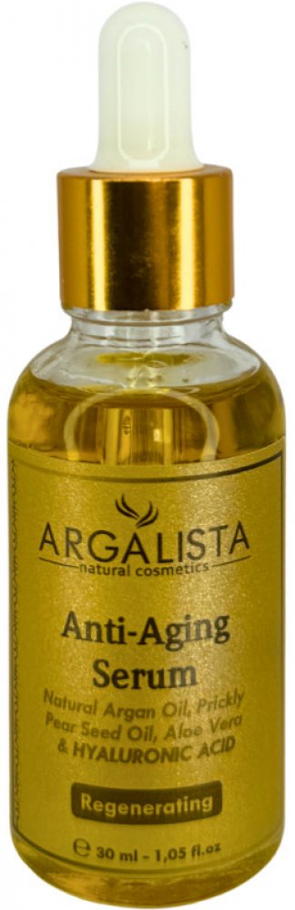 Argalista anti-aging sérum 30ml je unikátní kombinace arganového a opunciového oleje obohaceno o aloe vera, kyselinu hyaluronovou a vitamin E a C. Sérum díky obsahu kyseliny hyaluronové zabraňuje dehydrataci pokožky a tvorbě vrásek a naopak pomáhá pleť hydratovat a vyhlazovat. Arganový olej ve spojení s opunciovým olejem hloubkově pleť vyživí, regeneruje a rozzáří. Sérum je určeno pro všechny typy pleti na obnovu její pevnosti a pružnosti.