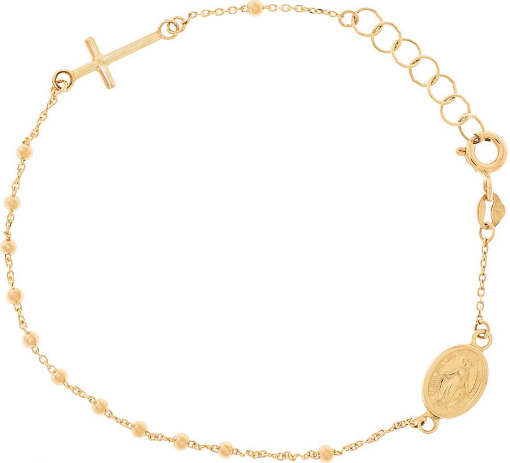 Náramek je vyroben ze žlutého zlata ryzosti 585/1000 (14 karátové zlato). Typ kuličky: hladká. Počet desátků na růženci: jeden. Výhodou u náramku je, že jeho délku můžete kdykoli měnit na kteroukoli z těchto hodnot: 16 cm, 17 cm a 18 cm. Náramek zdobí oboustranná Zázračná medailka Panny Marie a křížek. Zapínání je na kvalitní a bezpečný péřový kroužek.