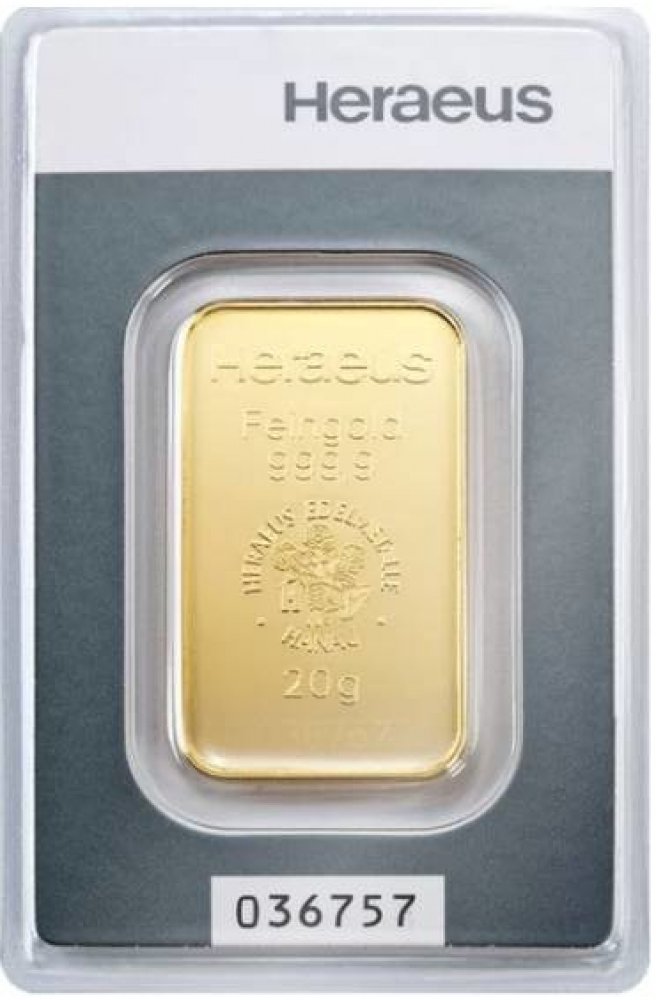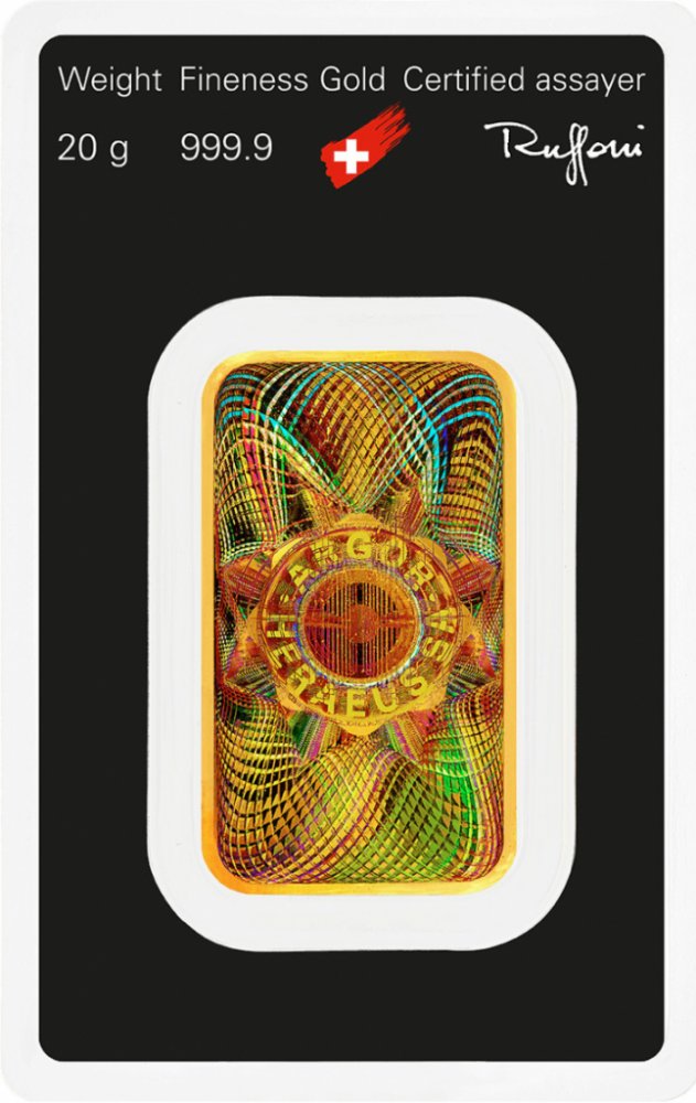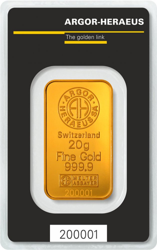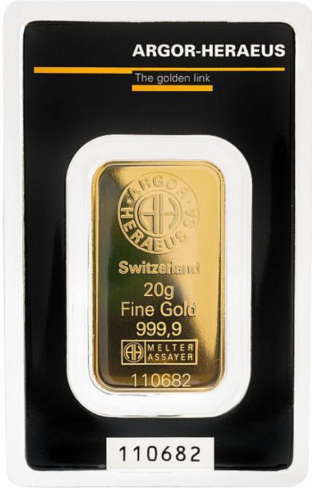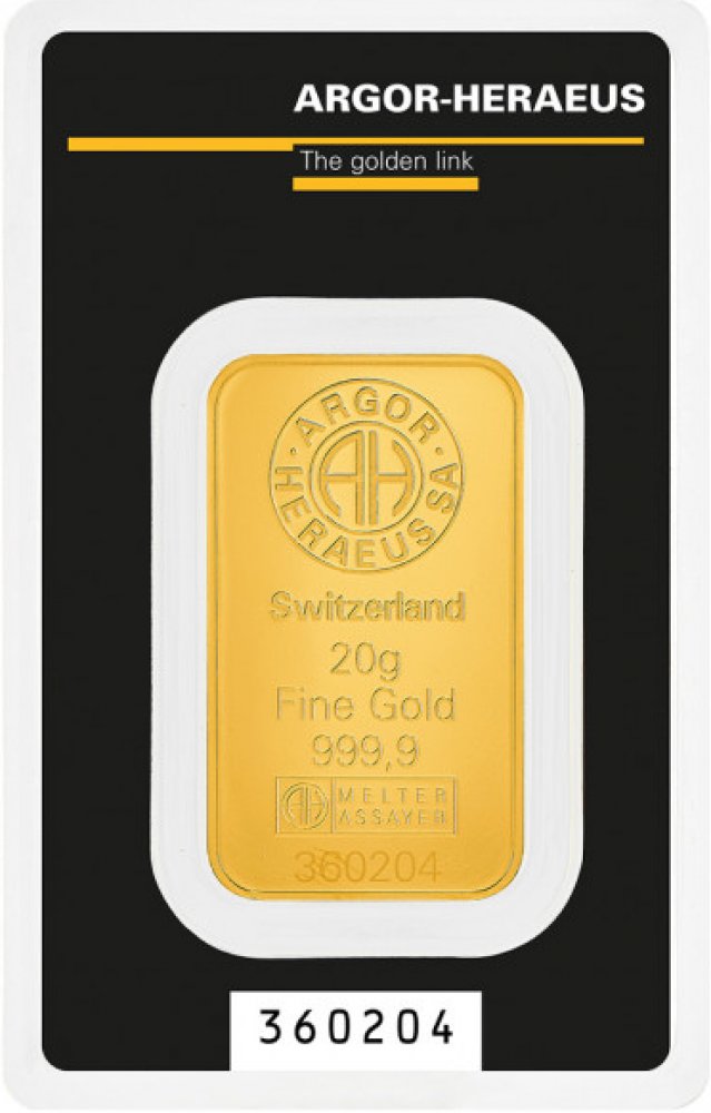 Dvaceti gramový slitek z řady investičních zlatých slitků Švýcarské slévárny Argor Heraeus.