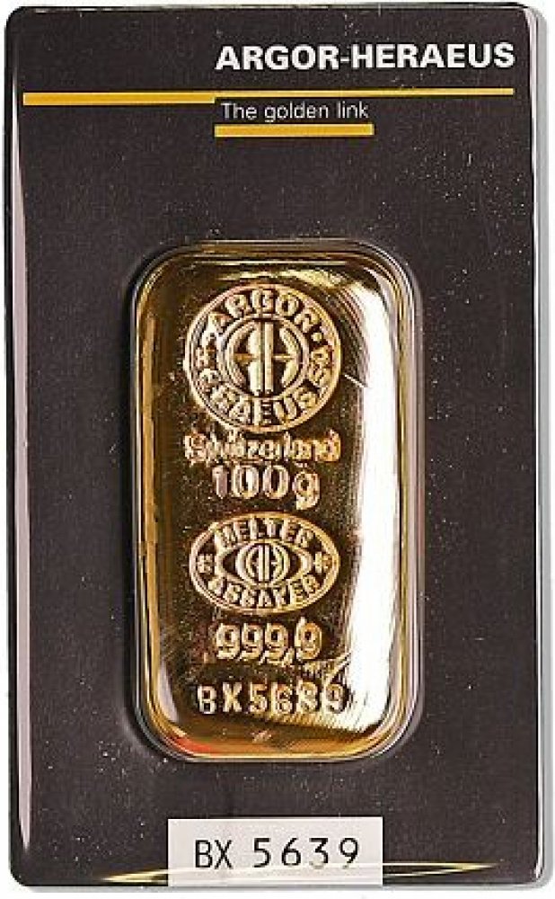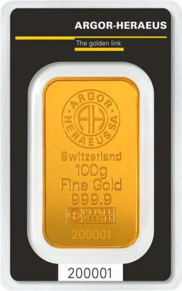 Investiční zlatý slitek litý s hmotností 100 gramů a ryzostí 999/1000, odpovídající čistotě 24 karátů, je vyrobený společností Argor-Heraeus. Žluté zlato použité k výrobě zaručuje čistotu a kvalitu, žádné drahé kameny nejsou přítomny. Povrch slitku je opatřený znakem výrobce a nápisy, které potvrzují jeho hmotnost a čistotu. Tvar je jednoduchý, s důrazem na přesnost a preciznost výroby. Šperk proš...