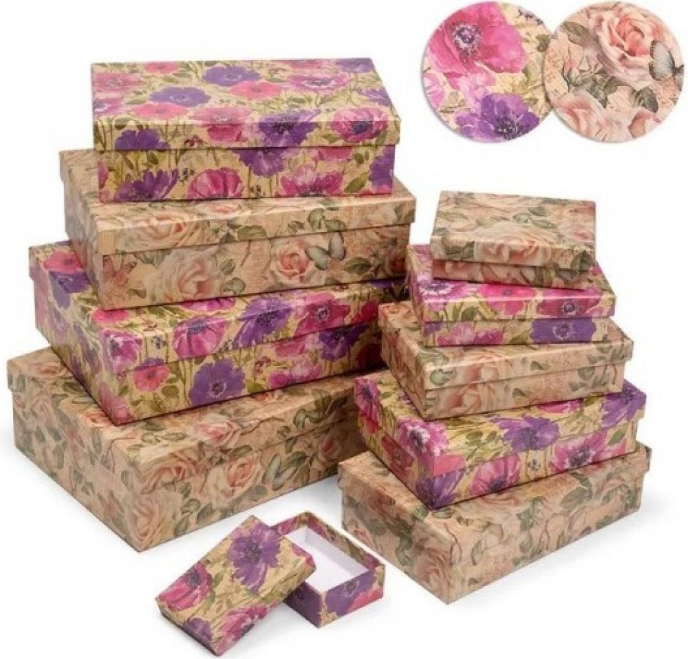 Sada papírových krabic z přírodního hnědého papíru ve tvaru obdélníku z dílny ARGUSu. Objsahuje 10 ks krabic, 2 různé květinové motivy, z každého motivu je 5 ks v setu.