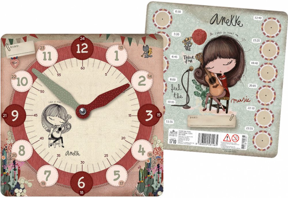Papírové dětské hodiny na výuku s designem známého děvčátka Anekke z dílny španělské návrhářky. * obsahují ciferník se zvýrazněnými čísly 3, 6, 9 a 12 také čísla od 1 po 12 a minutové dělení s pohyblivými ručičkami* zadní strana hodinek slouží jako učební pomůcka, do které mohou děti zakreslovat čas, který dostanou za úkol