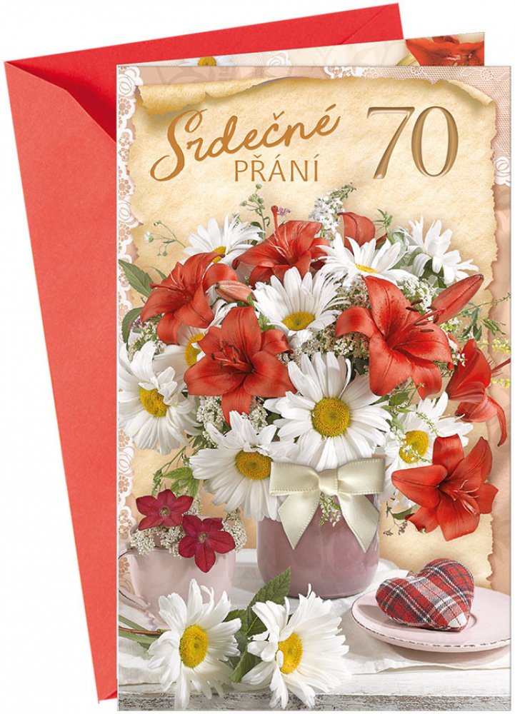 Přání k 70. narozeninám s lepenou mašličkou a s textem uvnitř.* součástí blahopřání je barevně sladěna obálka* originální technologie zpracování přáníčka od společnosti ARGUS - "Na detailu záleží!"