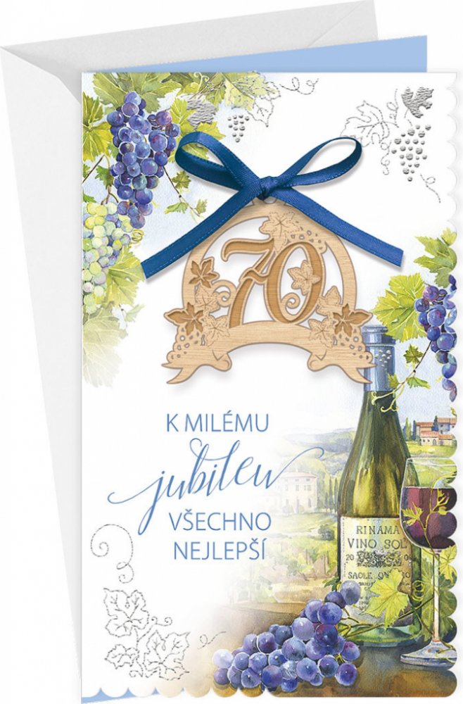 Přání k 70. narozeninám s textem uvnitř přání a dřevěnou ozdobou na vrchní části.* přání je zdobeno mašličkou* součástí blahopřání je barevně sladěna obálka* originální technologie zpracování přáníčka od společnosti ARGUS - "Na detailu záleží!"