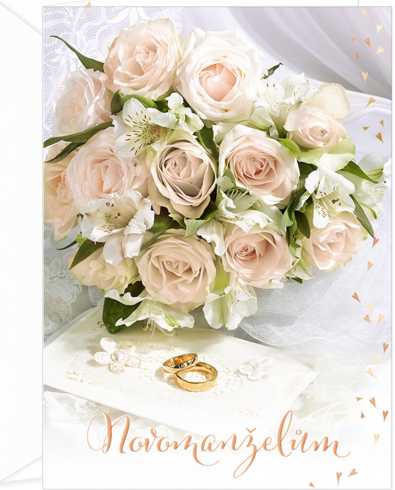 Svatební blahopřání s textem uvnitř: "Milí novomanželé, ze srdce Vám přejeme krásný společný život plný lásky, štěstí a vzajemného porozumění. Hodně štěstí" * 3D efekt umocňuje dojem prostoru* součástí je také barevně sladěná obálka* originální technologie zpracování od společnosti ARGUS - "Na detailu záleží!"