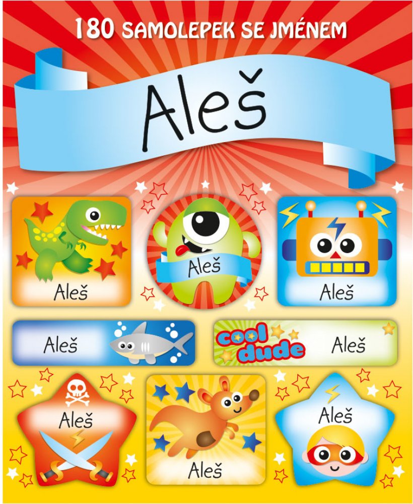 Samolepky se jménem obsahují 15 listů, 180 ks samolepek. Samolepky si mohou děti lepit na cokoli a kamkoli – zápisníčky, obaly sešitů, do památníčků nebo na papír a vytvořit si vlastní obrázek a to hlavní, označit si věci svým jménem.
