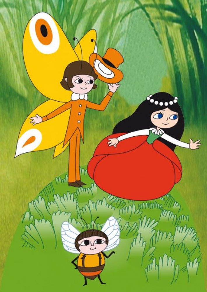 Motýl Emanuel uctivě smeká za Makovou panenkou, která se sklání k někomu, kdo zůstává skryt za hranicí pohledu. Výjev se odehrává na travnaté letní louce, na obrázku je s nimi také včelka. Zadní strana pohledu bílá, na dolním okraji barevný detail narcisů a tulipánů.