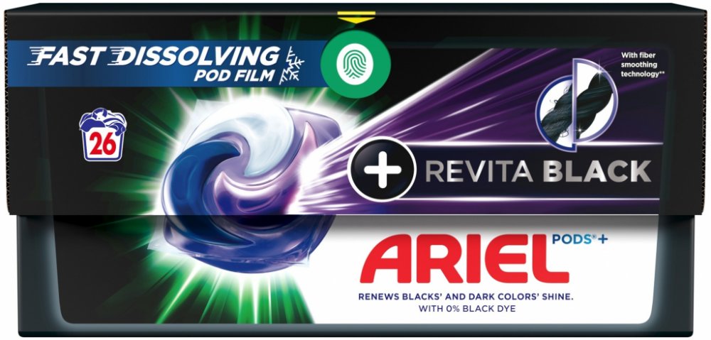 Prací kapsle Ariel + Revitablack All-In-1 PODS obnovují lesk černých a tmavých tkanin díky použití technologie obnovy vláken, která funguje i ve studené vodě. Každá malá kapsle poskytuje jedinečnou mycí sílu a díky unikátní vícekomorové struktuře kapsle jsou její složky od sebe odděleny a vzájemně se nespojí až do začátku praní.