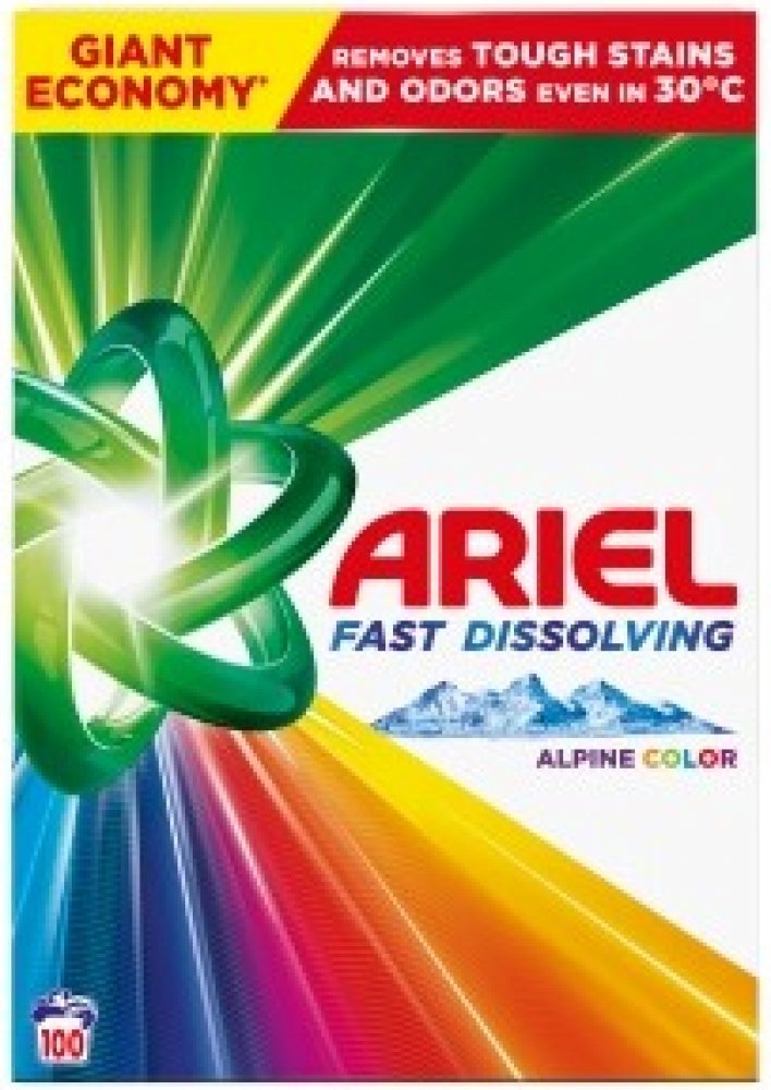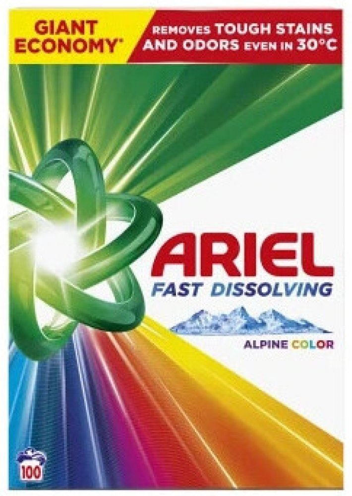 Vhodný na barevné prádlo. Ariel nezanechává zbytky na vypraném prádle a uchovává krásně zářivé barvy. Perfektně pronikne do hloubky vláken a odstraní i velmi odolné skvrny díky speciální technologii. Obsažené enzymy pomáhají ochraňovat a zjemňovat bavlněné prádlo a účinné aktivní látky působí už při 30 °C. Odstranění odolných nečistot, příjemná svěží vůně, 100 pracích dávek, hmotnost 5,839 kg.