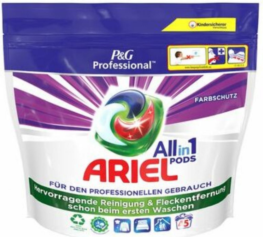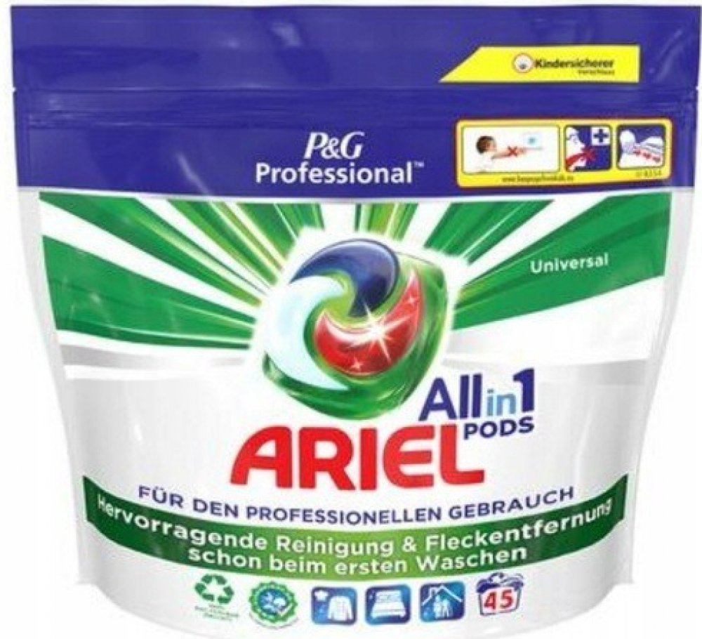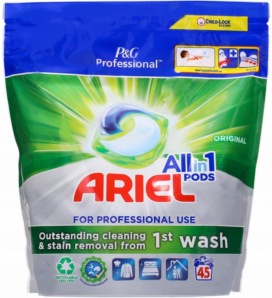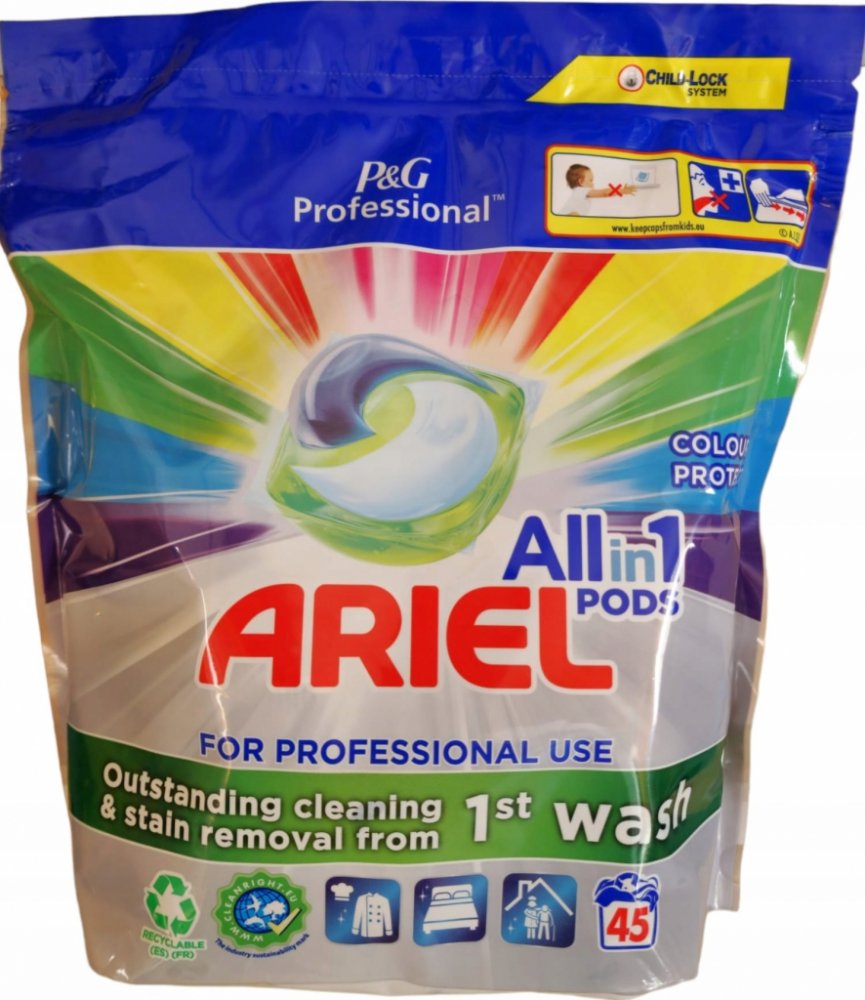 Ariel Professional Allin1 Original Kapsle na praní 45 Kusů Ariel Professional Allin1 Original jsou profesionální kapsle na praní,které zajišťují dokonalou čistotu a svěžest tkanin při každém praní. Díky unikátní formuli s několika komorami obsahují kapsle všechny potřebné prací složky v ideálním poměru.