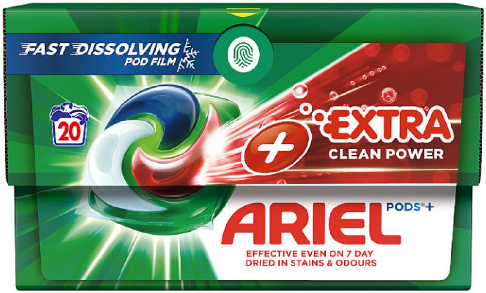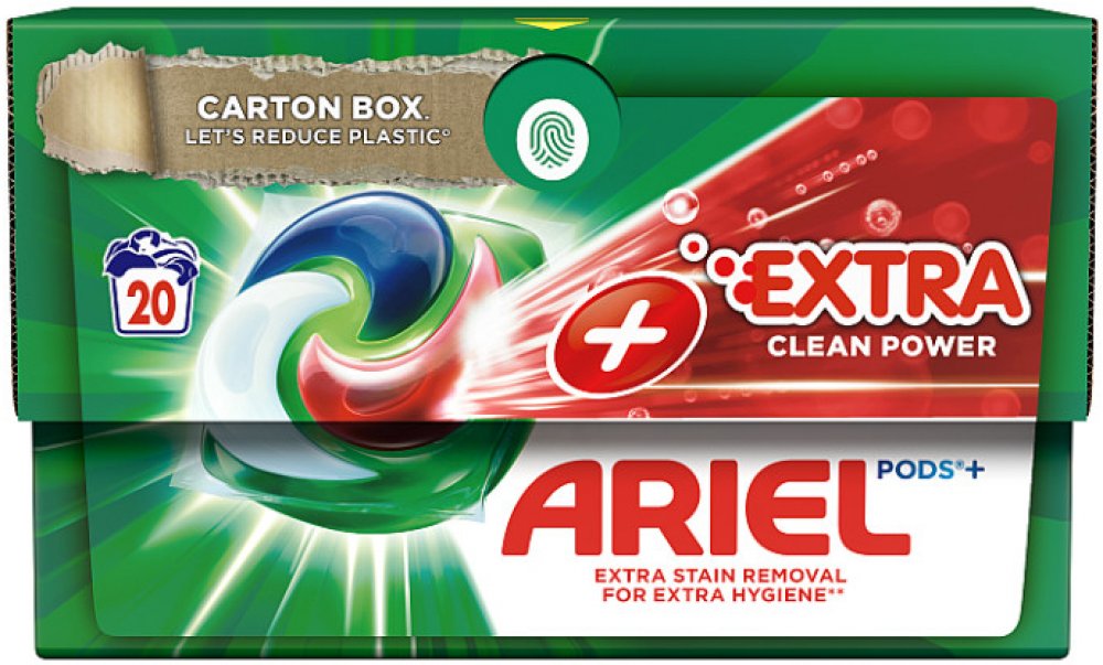 Gelové kapsle Ariel Extra Clean Power Plus obsahuje další červenou komůrku pro extra odstraňování skvrn a extra hygienu. Díky recyklovatelnému kartonovému balení Ecoclic nyní kapsle na praní Ariel navíc pomáhají snižovat množství plastů. Obsahuje maximálně 5 % plastu a je navrženo tak, aby kapsle bezpečně uchovalo. Kapsle na praní Ariel jsou navrženy pro praní při nižších teplotách, s unikátními technologiemi jako Cool Clean technology. Po kontaktu s vodou se obal kapslí rozpustí a uvolní účinné látky, které odstraňují skvrny. Z kapslí Ariel proto tyto kapsle All-in-1 PODS +Extra Clean Power vyperou vůbec nejdůkladněji a nejúčinněji.