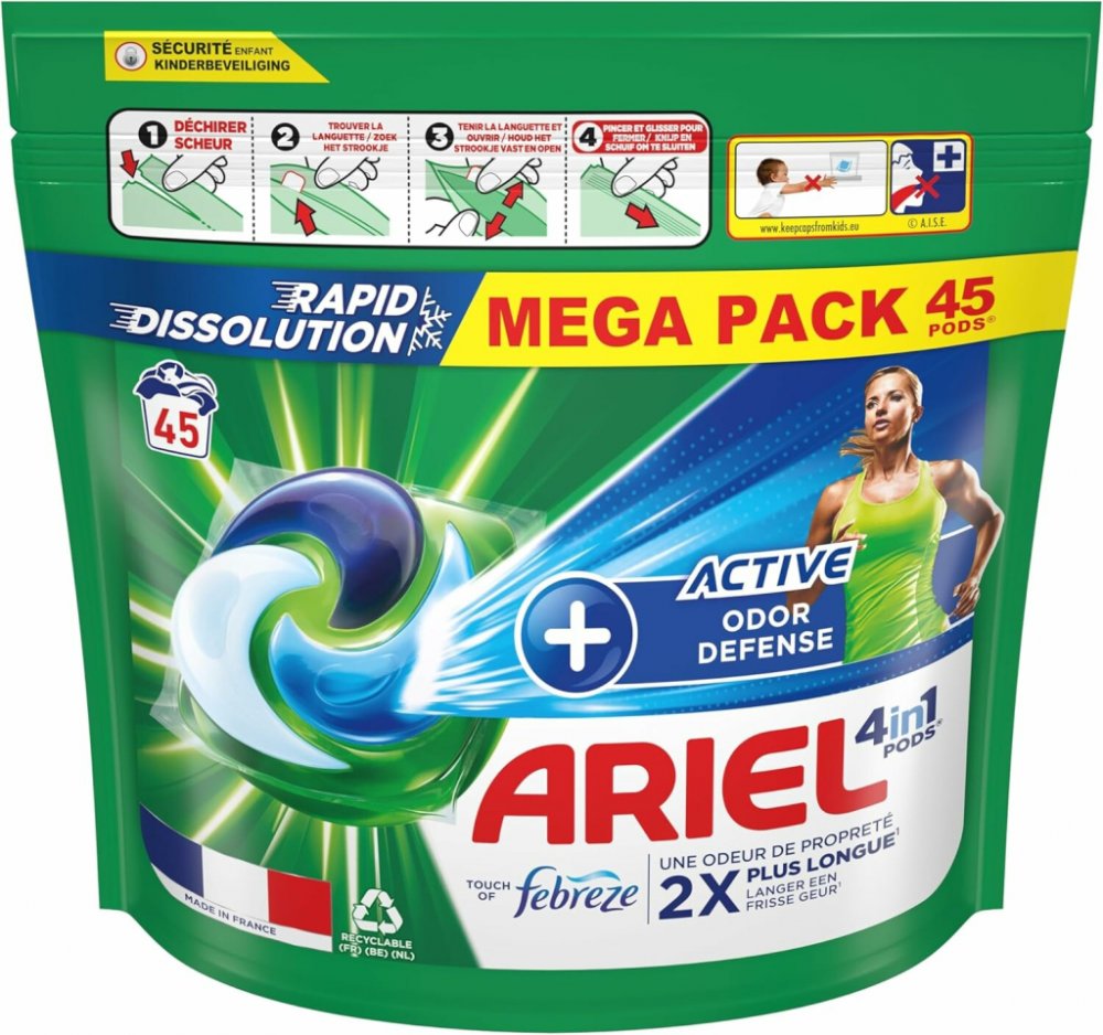 Užijte si svěží a čisté prádlo s Ariel gelovými kapslemi 4in1 Active Odor Defense Sport – pro maximální čistotu a dlouhotrvající svěžest.