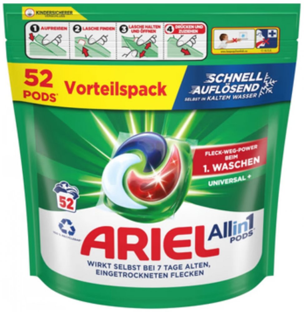 Ariel gelové kapsle 52 ks All in 1 na praní bílého i stálobarevného prádla se svěží vůní spojuje 3 účinky v jediné kapsli - velmi účinné praní, odstraňování skvrn a svěžest. Praní při teplotách již od 20 °C a účinné i při vysokých teplotách do 95 °C. Prostupuje do hloubky vláken, čímž zajišťuje zářivou čistotu a extra svěžest po dlouhou dobu. Působí velmi účinně i při nízkých teplotách je vhodný pro praní od 20°C do 95°C. Poradí si i odolnými i mastnými skvrnami a je šetrný k vašemu oblečení. Oblečení zůstane po vyprání dlouho zářivé a svěží. POUŽITÍ:Gelovou kapsli vložte do bubnu pračky, poté až prádlo! Kapsli nepropichujte, nedělte ani nestříhejte! Nejprve kapsle, poté prádlo!SLOŽENÍ:viz Ingredients na obale.UPOZORNĚNÍ:Uchovávejte mimo dosah dětí. Nebezpečí vážného poškození očí. Dráždí kůži. Zamezte styku s kůží a očima. Při zasažení očí okamžitě důkladně vypláchněte vodou a vyhledejte lékařskou pomoc. Použijte osobní ochranné prostředky pro oči a obličej. Při požití okamžitě vyhledejte lékařskou pomoc a ukažte tento obal nebo označení. Nedotýkejte se kapslí mokrýma rukama. Balení po každém použití uzavřete, zabraňte kontaktu s vlhkostí. Kapsle nemačkejte, neloupejte, ani neotvírejte pomocí zubů. Uchovávejte na suchém a chladném místě. Obsahuje: MEA-C10-13 alkyl benzenesulfonate, MEA-laureth sulfate, C12-14 Pareth-n, citronellol, tetrahydrolinalool, isoeugenol, tetramethyl acetyloctahydronaphthalenes, delta-damascone, methylundecanal. Může vyvolat alergickou reakci.ŽIVOTNÍ PROSTŘEDÍ:Zcela prázdný a čistý plastový obal je možné recyklovat. Tříděním odpadu chráníte životní prostředí. Má to smysl.