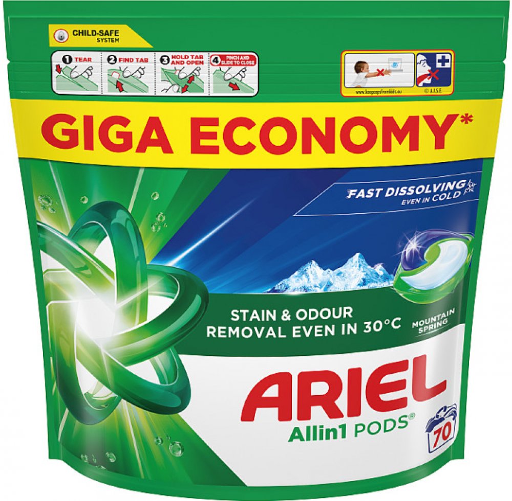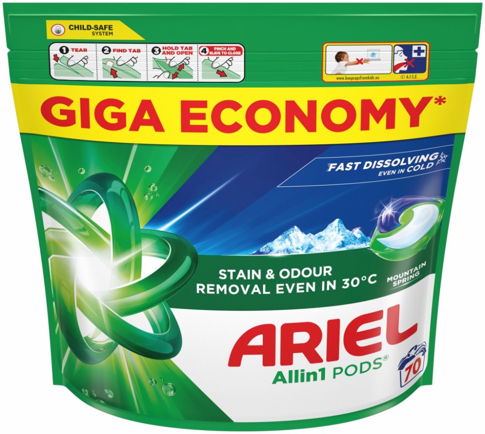 Kapsle na praní Ariel All-in-1 PODS Mountain Spring mají skvělé účinky při odstraňování skvrn už od prvního praní při nižší teplotě. Výjimečné prací účinky v jedné kapsli na praní: 1. Odstraňují skvrny 2. Hygienická čistota 3. Osvěžují 4. Skvělé pro praní při nízké teplotě díky technologii COOL CLEAN 5. obal 100% rozpustný ve vodě. Kapsle na praní Ariel s chytrým vícekomorovým designem udrží složky oddělené do té doby, než se namočí. Po kontaktu s vodou se obal kapslí rozpustí a uvolní účinné technologie, které odstraňují skvrny. Kapsle na praní prádla Ariel All-in-1 PODS se navíc dodávají v recyklovatelném obalu. VAROVÁNÍ! Tento výrobek může být škodlivý a způsobit vážná zranění. Kapsle Ariel All-in-1 PODS uchovávejte mimo dosah dětí.