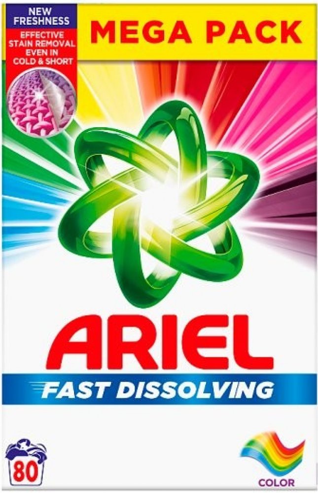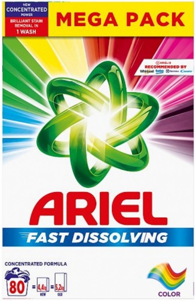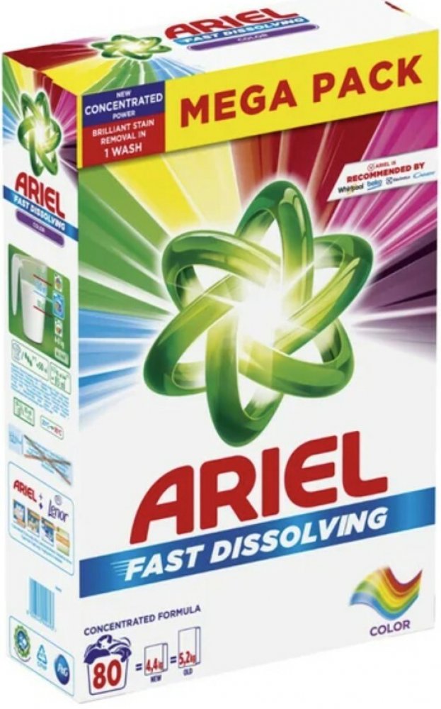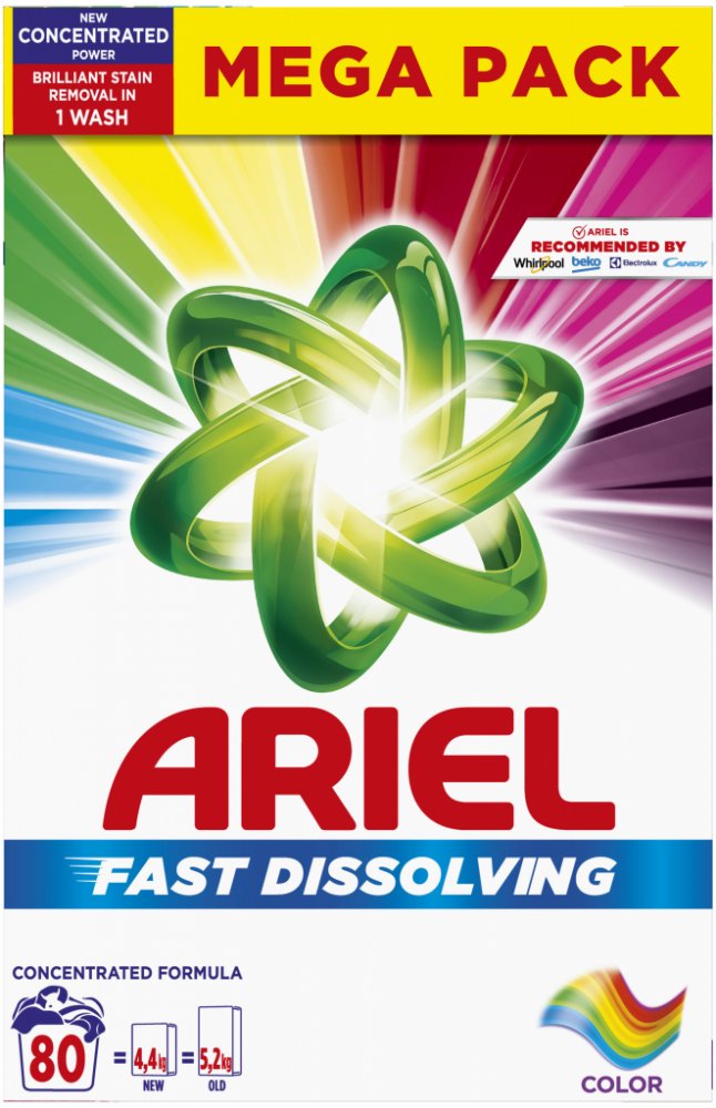Vlastnosti Ariel Color pracího prášku:- prací prášek vhodný na barevné prádlo.- balení 80 praní, 4,4 kg- dodá prádlu svěží vůni - rychle se rozpouští a nezanechává zbytky na prádle- ochrání tkaniny- uchovává zářivé barvy prádla- účinný již od teploty 30 °C- chrání proti vodnímu kameni- zabraňuje usazování špíny a skvrn v tkanině